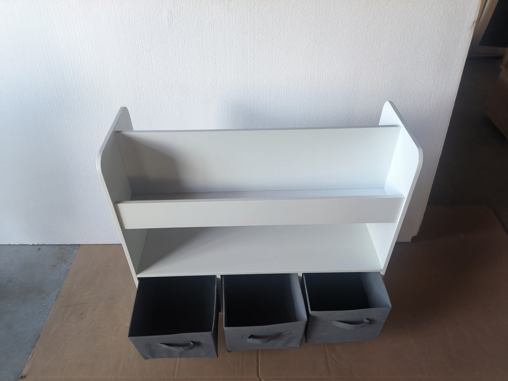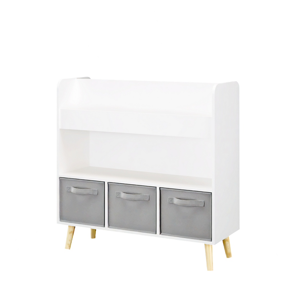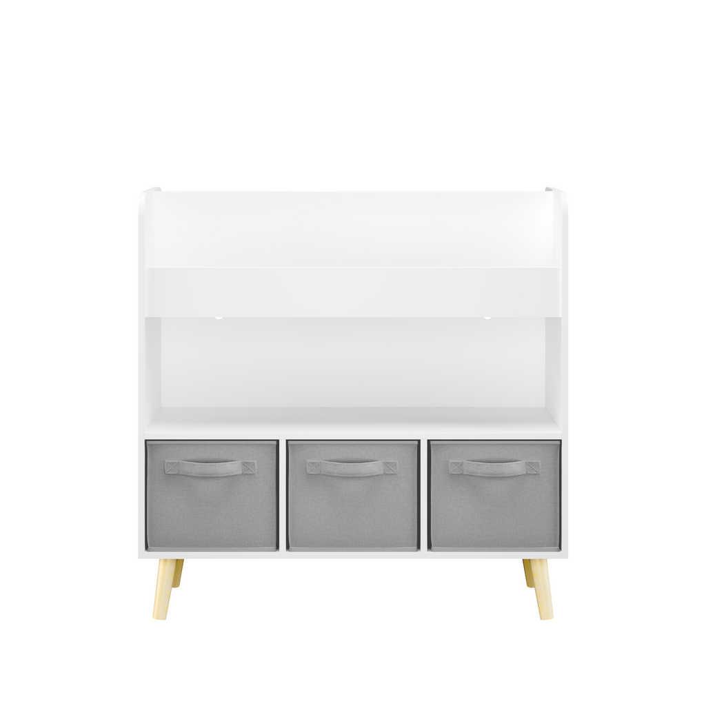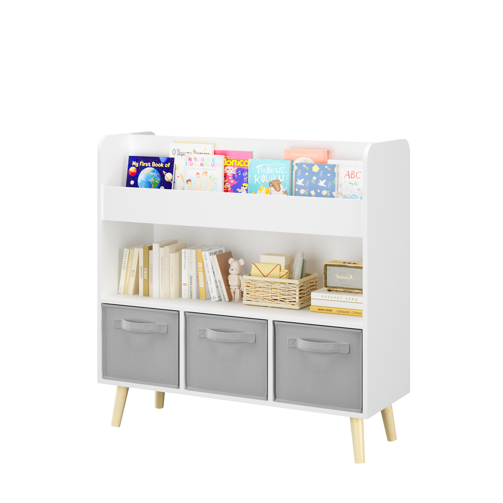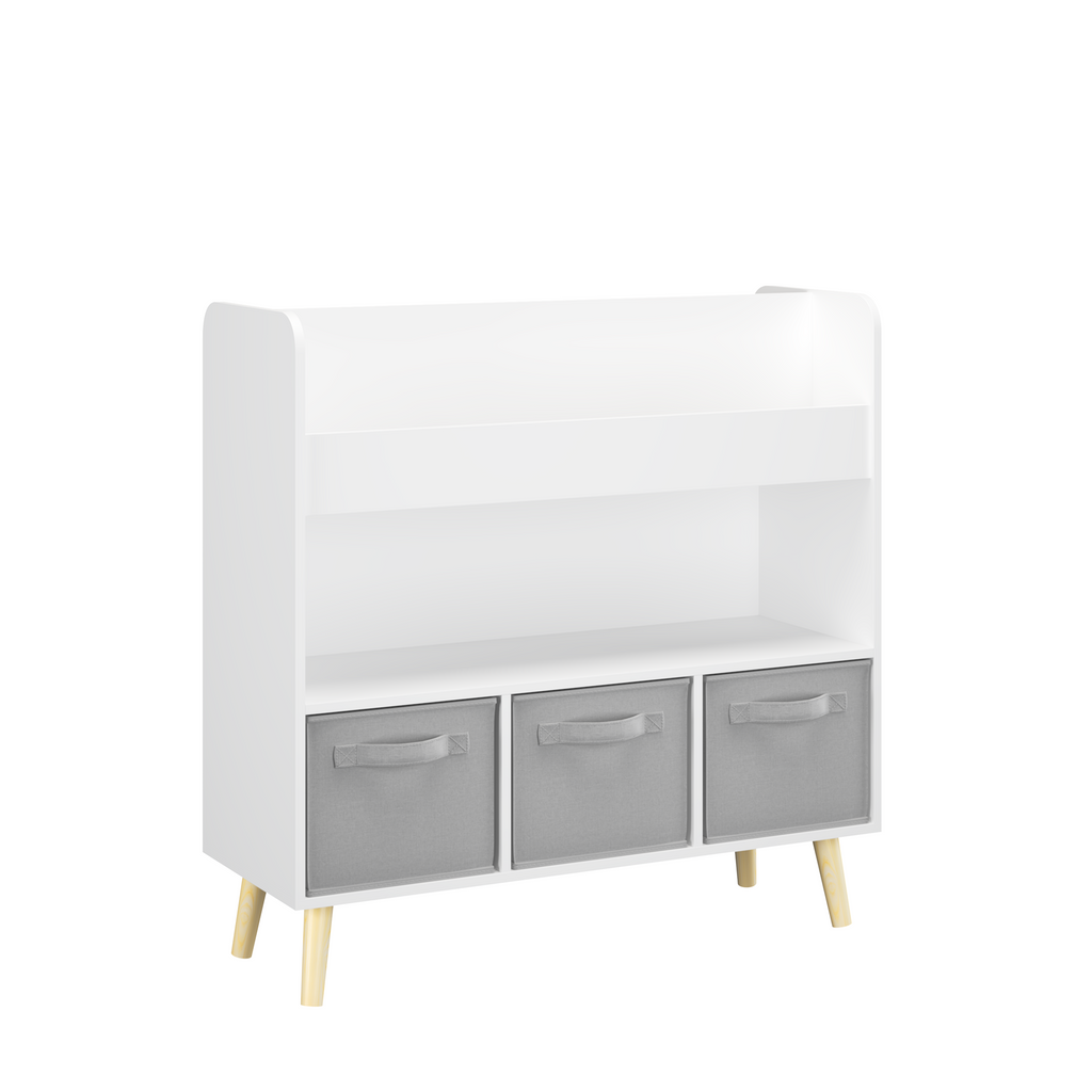 Kids Bookshelf with 3 Fabric Bins, Modern Children's Bookcase with Storage for Toys and Books, Toddler Book Organizer Shelf for Playroom, Bedroom, or Nursery, White and Gray