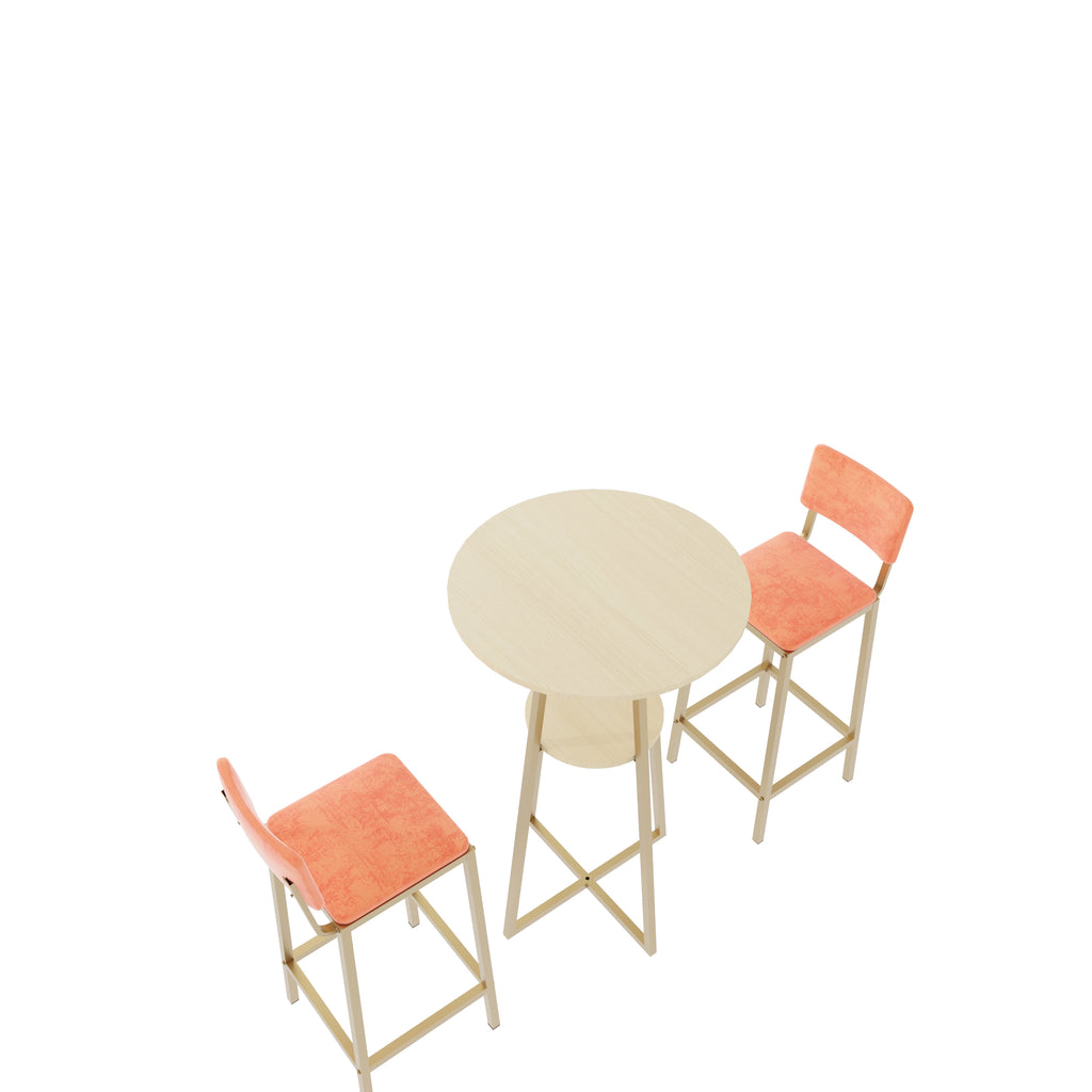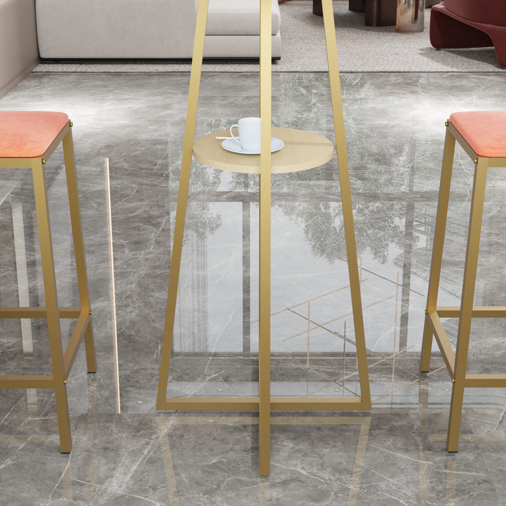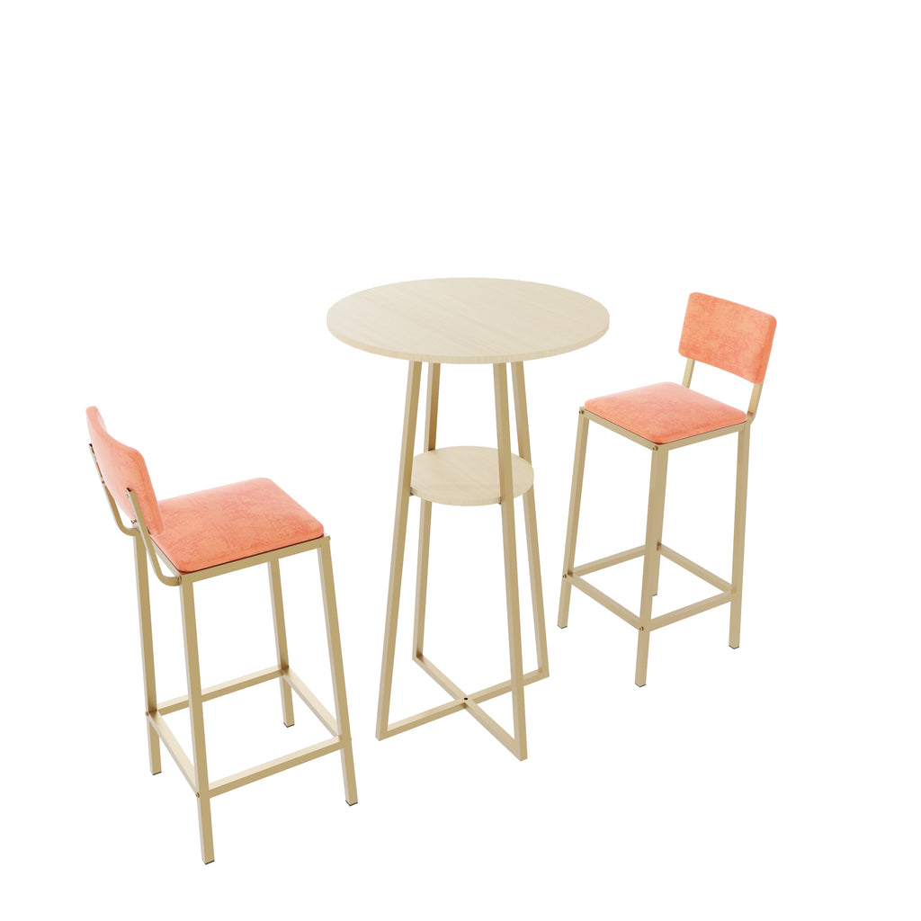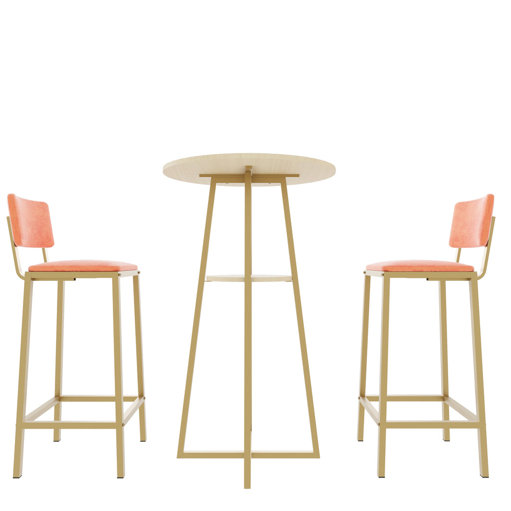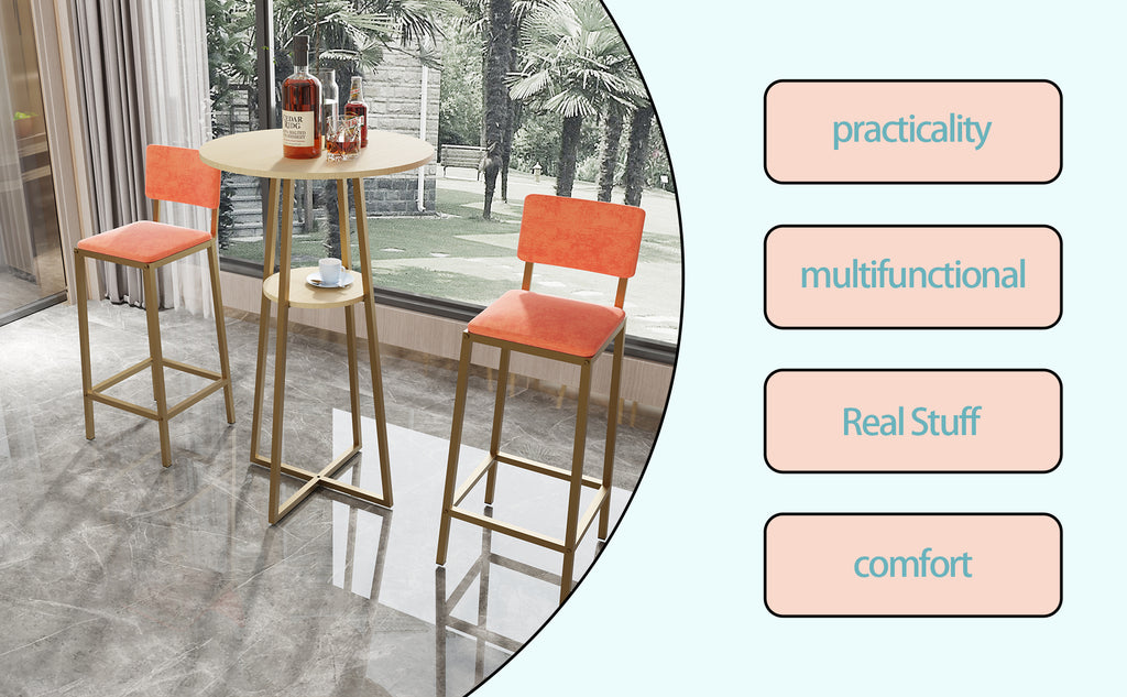This three piece set of bar tables and chairs features an elegant design and beautiful appearance. The golden frame is paired with sponge cushions and backrests, making it perfect for placing in various styles of spaces such as dining rooms, living rooms, bedrooms, balconies, courtyards, etc