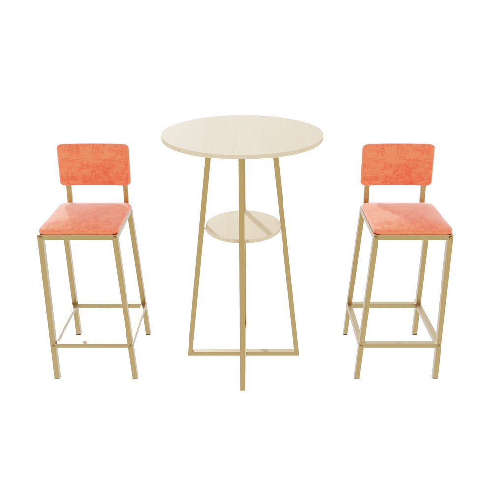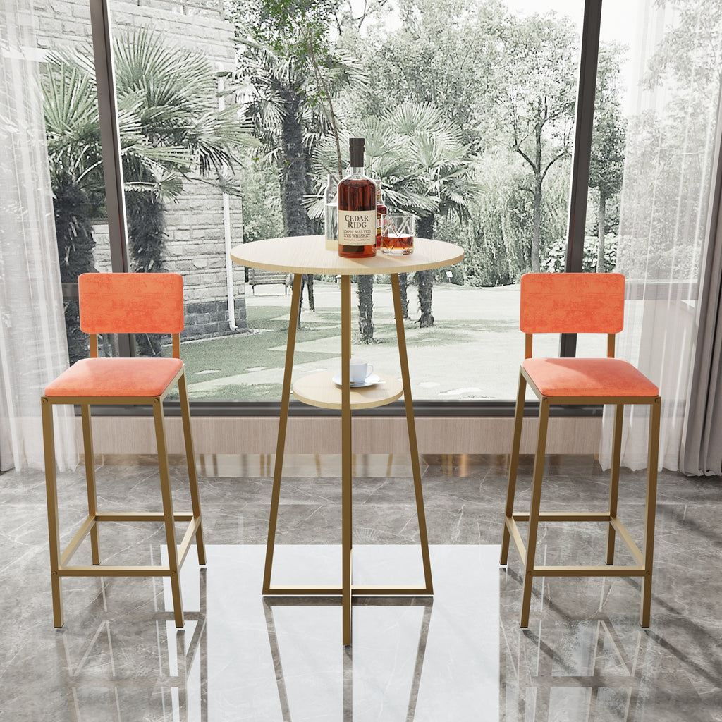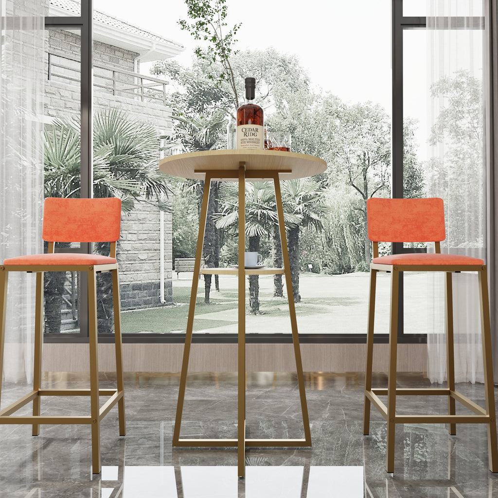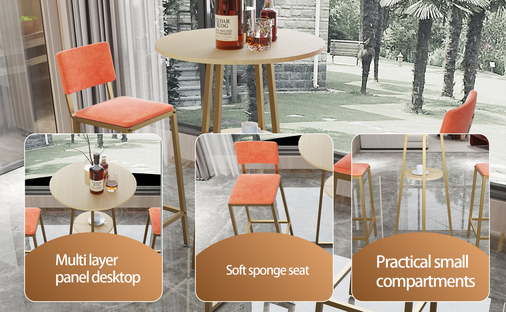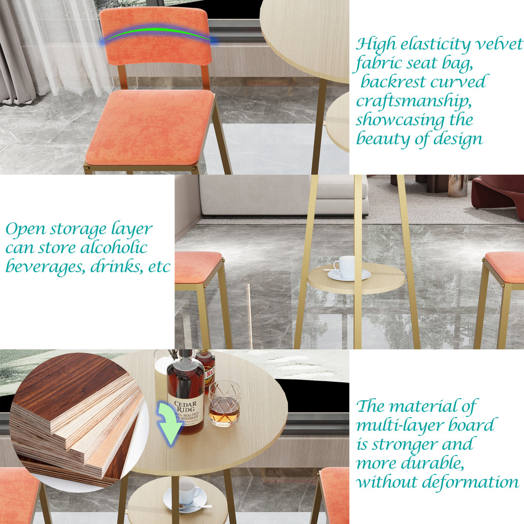 Bar table and chairs three piece set, gold frame, sponge made seat cushions and backrests, bar table with storage function (gold+beige+orange cushion)