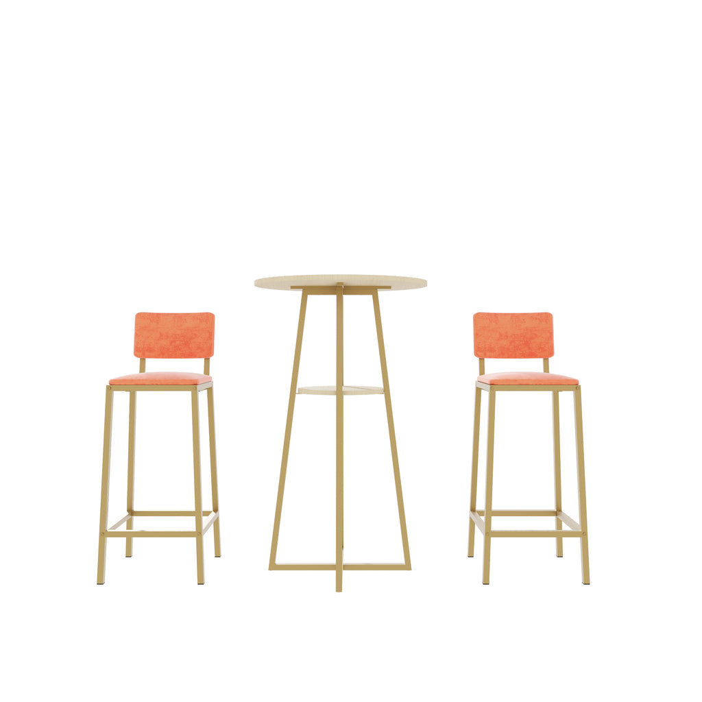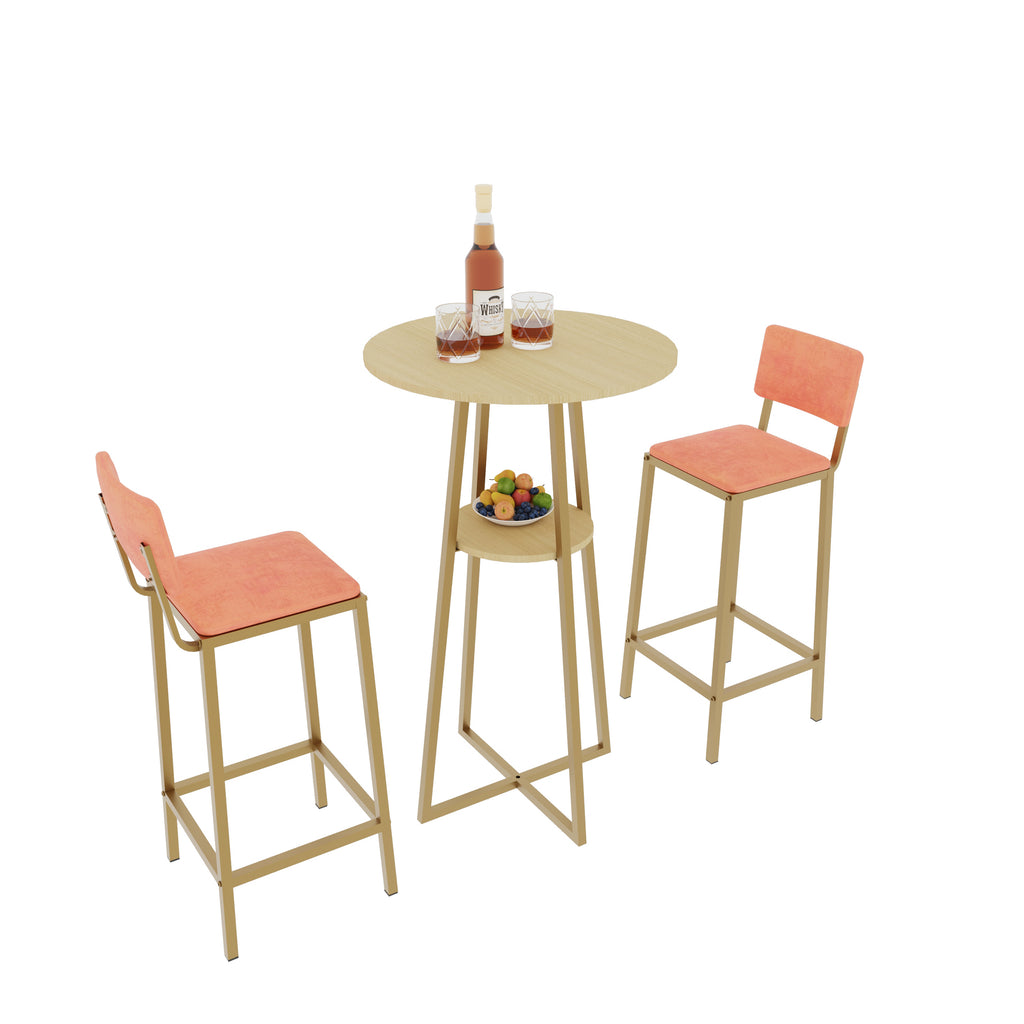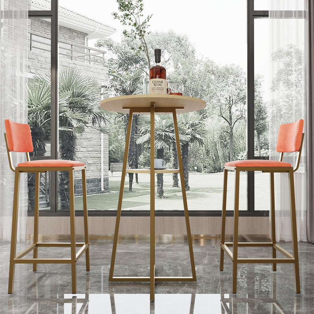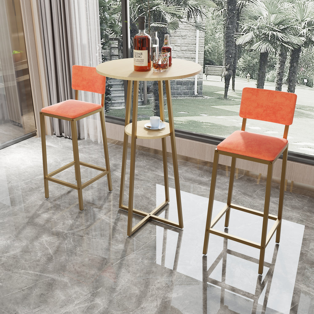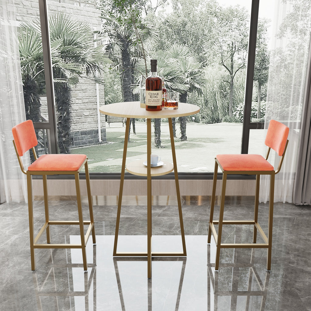 Bar table and chairs three piece set, gold frame, sponge made seat cushions and backrests, bar table with storage function (gold+beige+orange cushion)