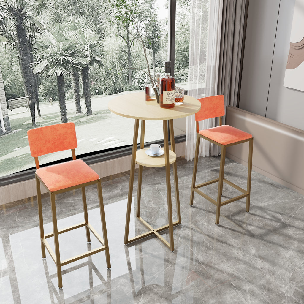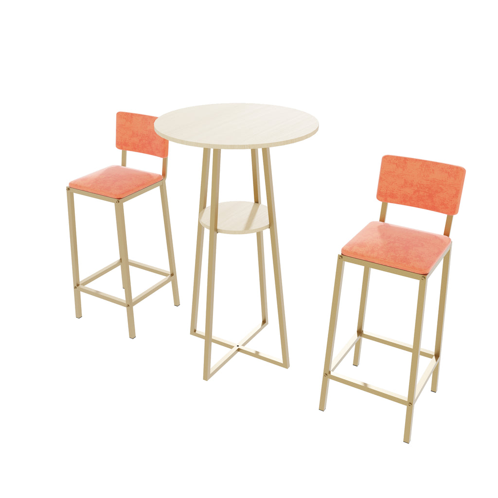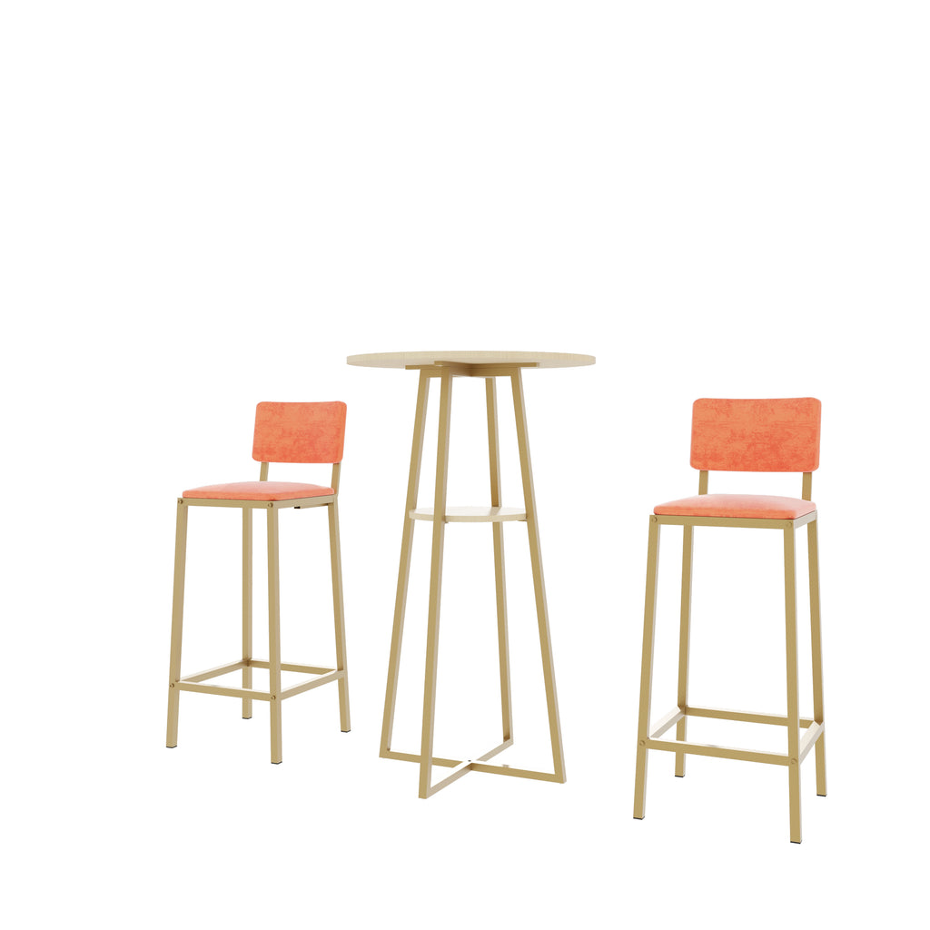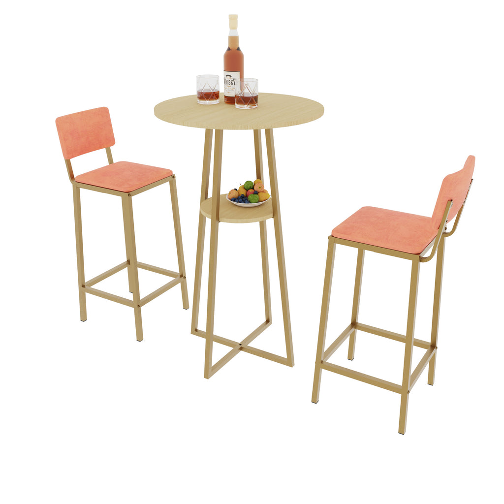 Bar table and chairs three piece set, gold frame, sponge made seat cushions and backrests, bar table with storage function (gold+beige+orange cushion)