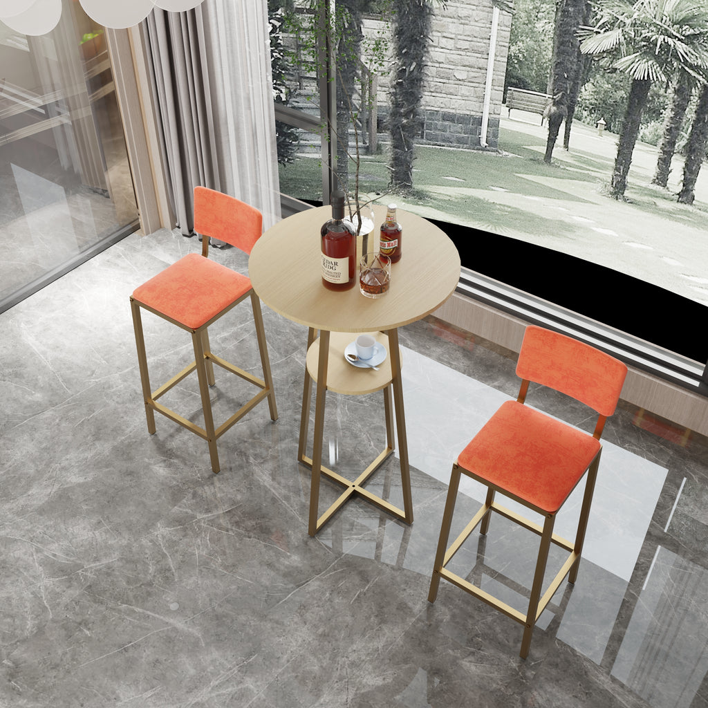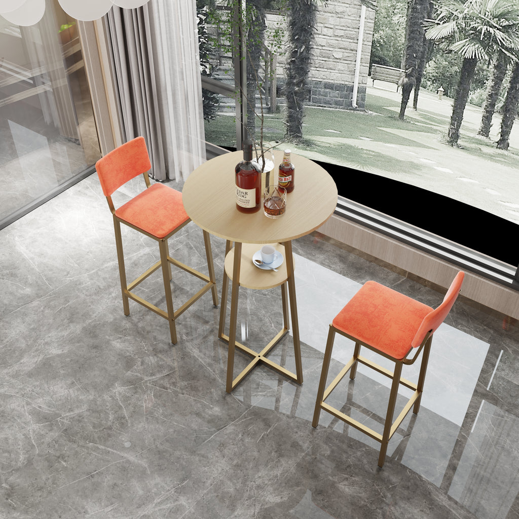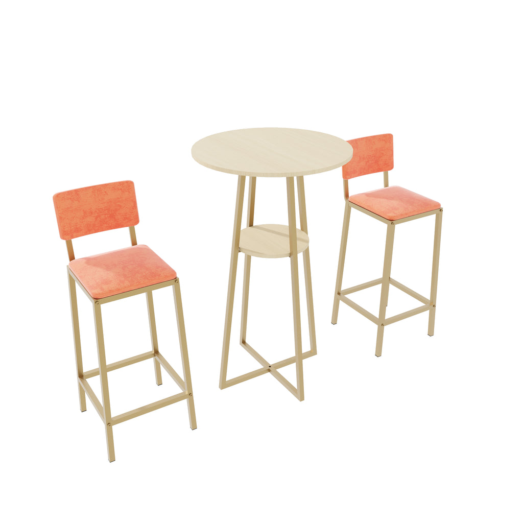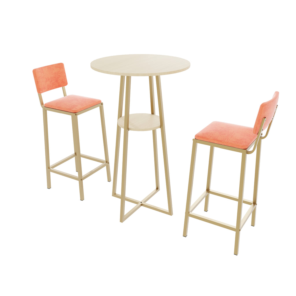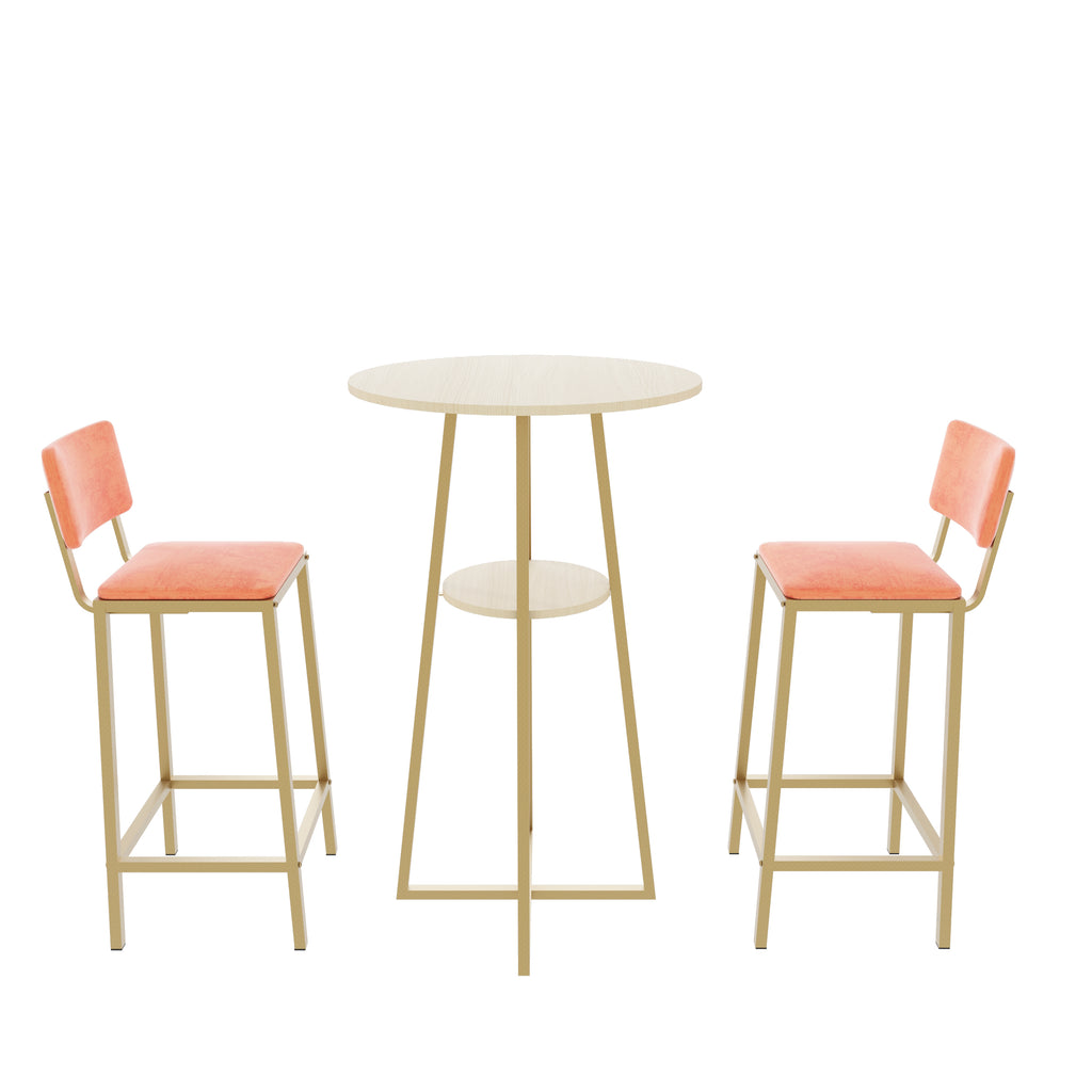 Bar table and chairs three piece set, gold frame, sponge made seat cushions and backrests, bar table with storage function (gold+beige+orange cushion)