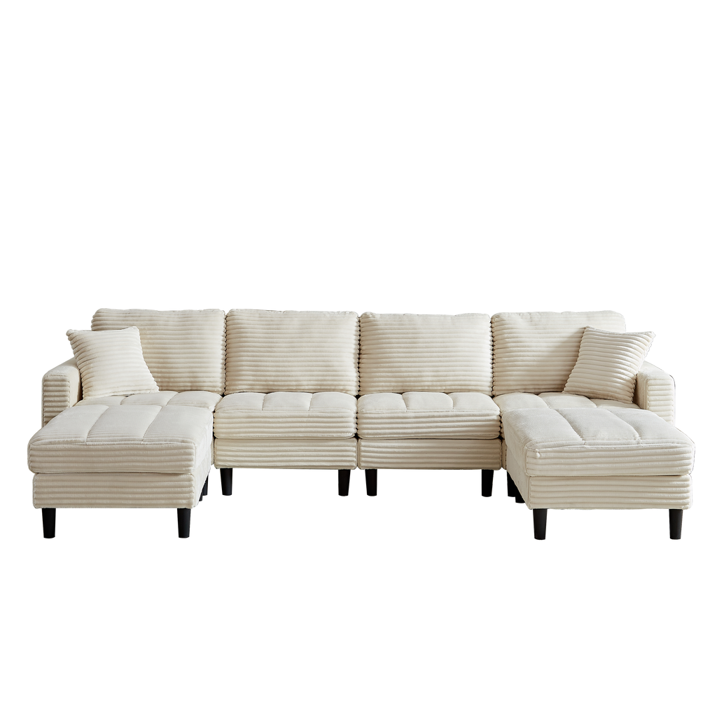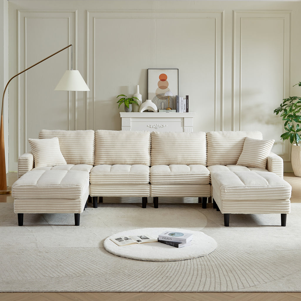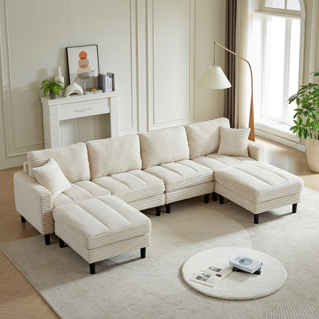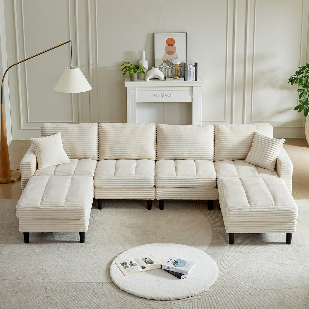 122.5-Inch Oversized U-Shaped Modular Sofa, Corduroy Fabric Sofa, Living Room Sectional Sofa with 2 Pillows, Two ottoman, plastic leg, Beige
