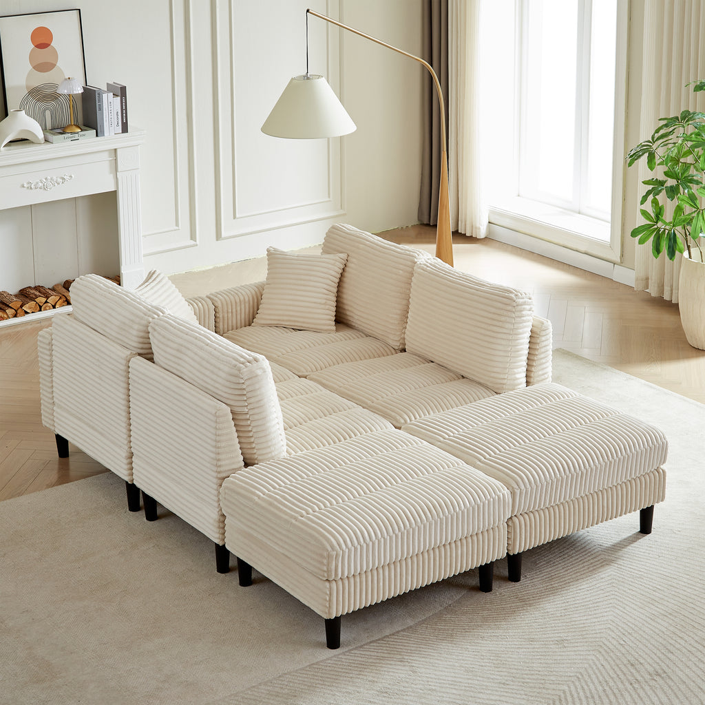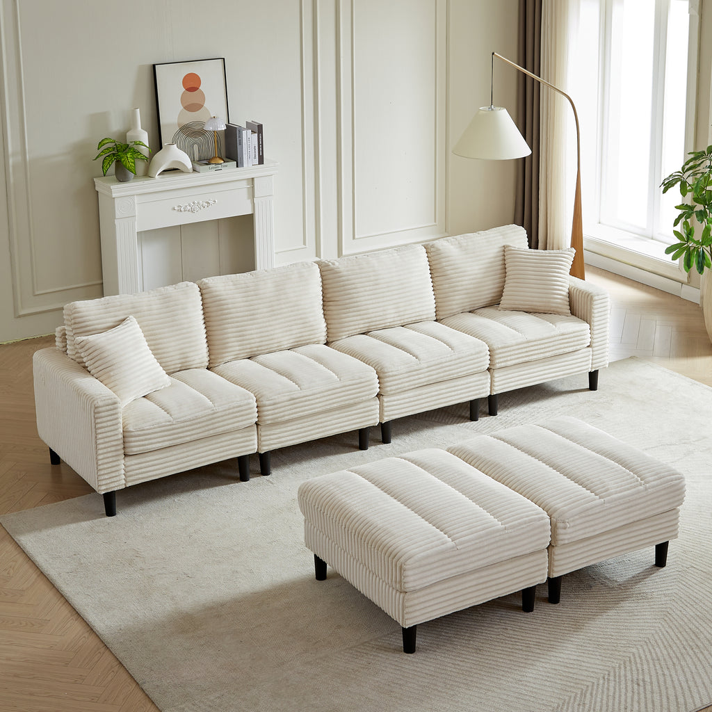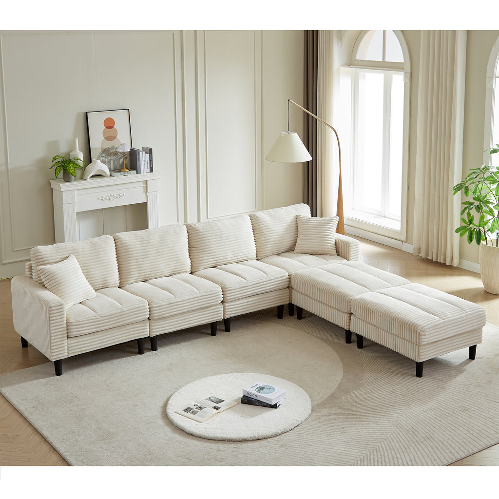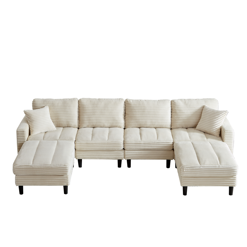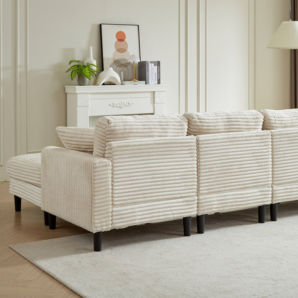 122.5-Inch Oversized U-Shaped Modular Sofa, Corduroy Fabric Sofa, Living Room Sectional Sofa with 2 Pillows, Two ottoman, plastic leg, Beige