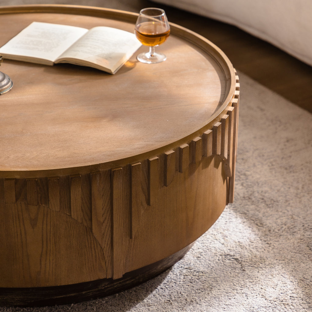Coffee Table Round Wood Modern Solid Wood Veneer Handcrafted Relief Tea Table with Sturdy Pedestal for Apartment,Living Room