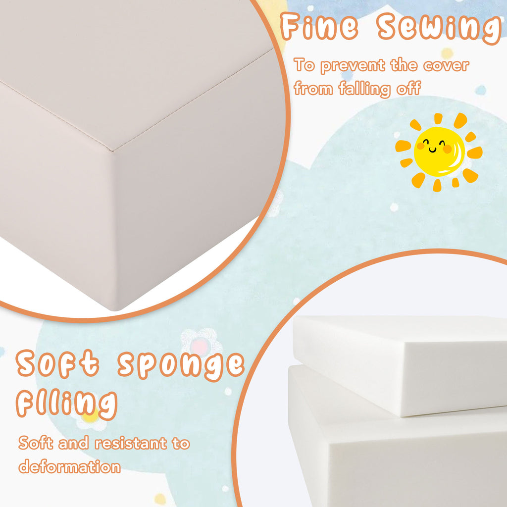 • This crawling toy set consists of a staircase, a square mat, a rectangular mat, a fan-shaped mat, a wavy climbing mat, and a cylinder.