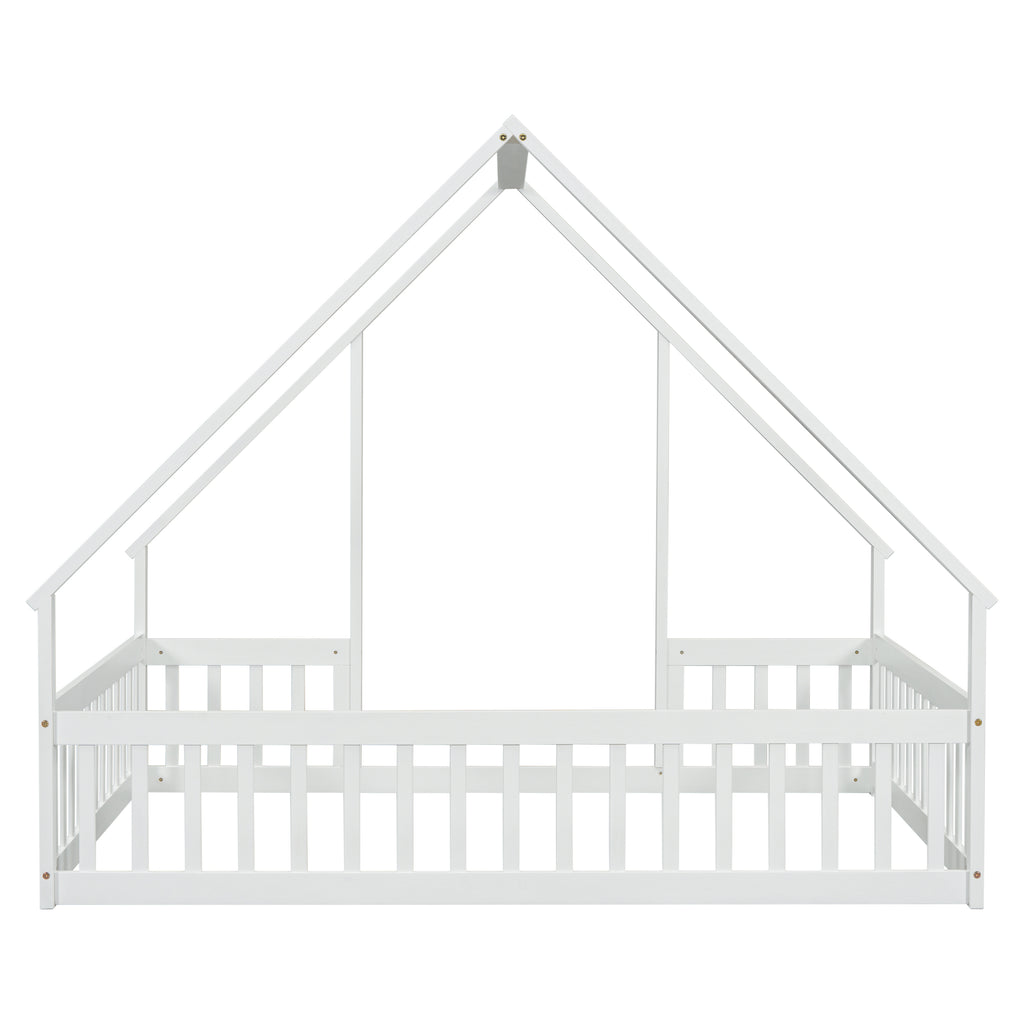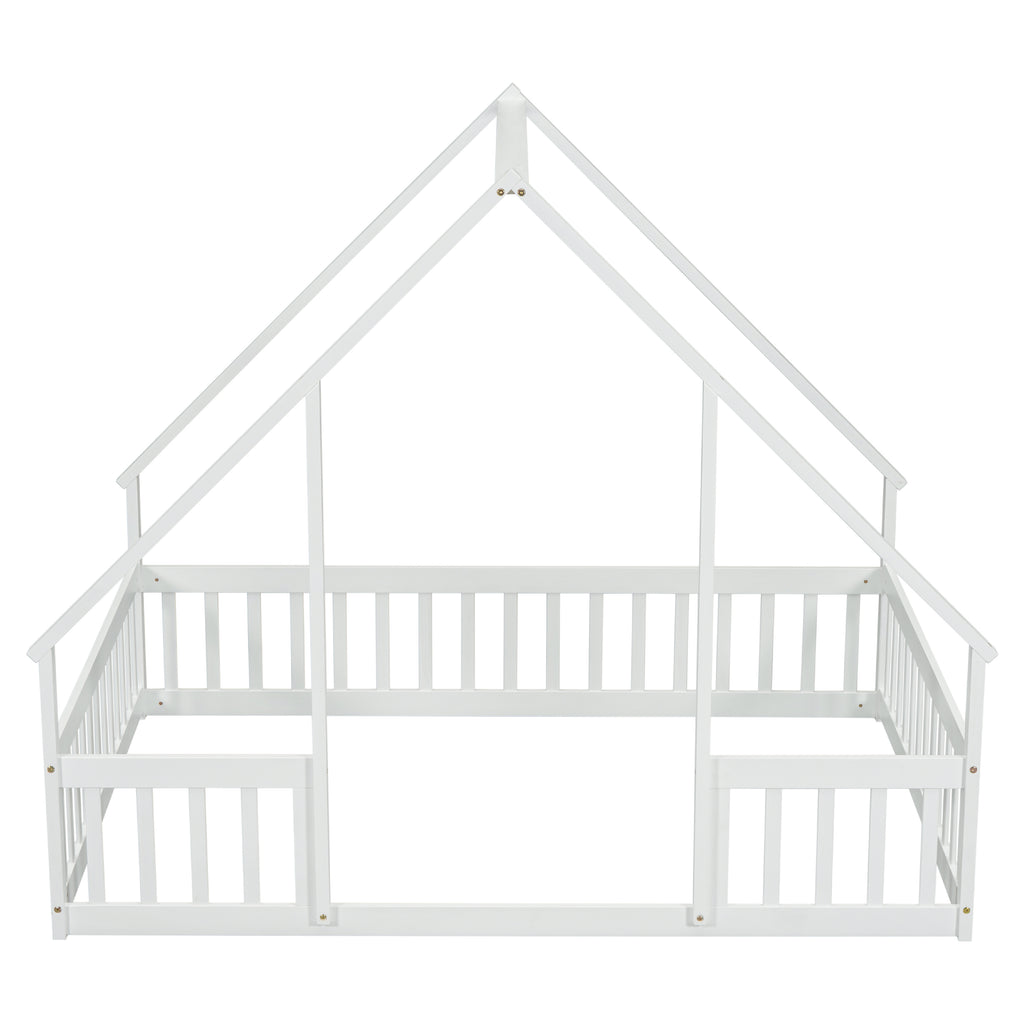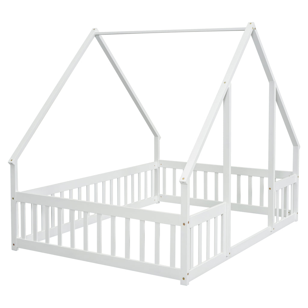 Full Wood House-Shaped Floor Bed with Fence, Guardrails