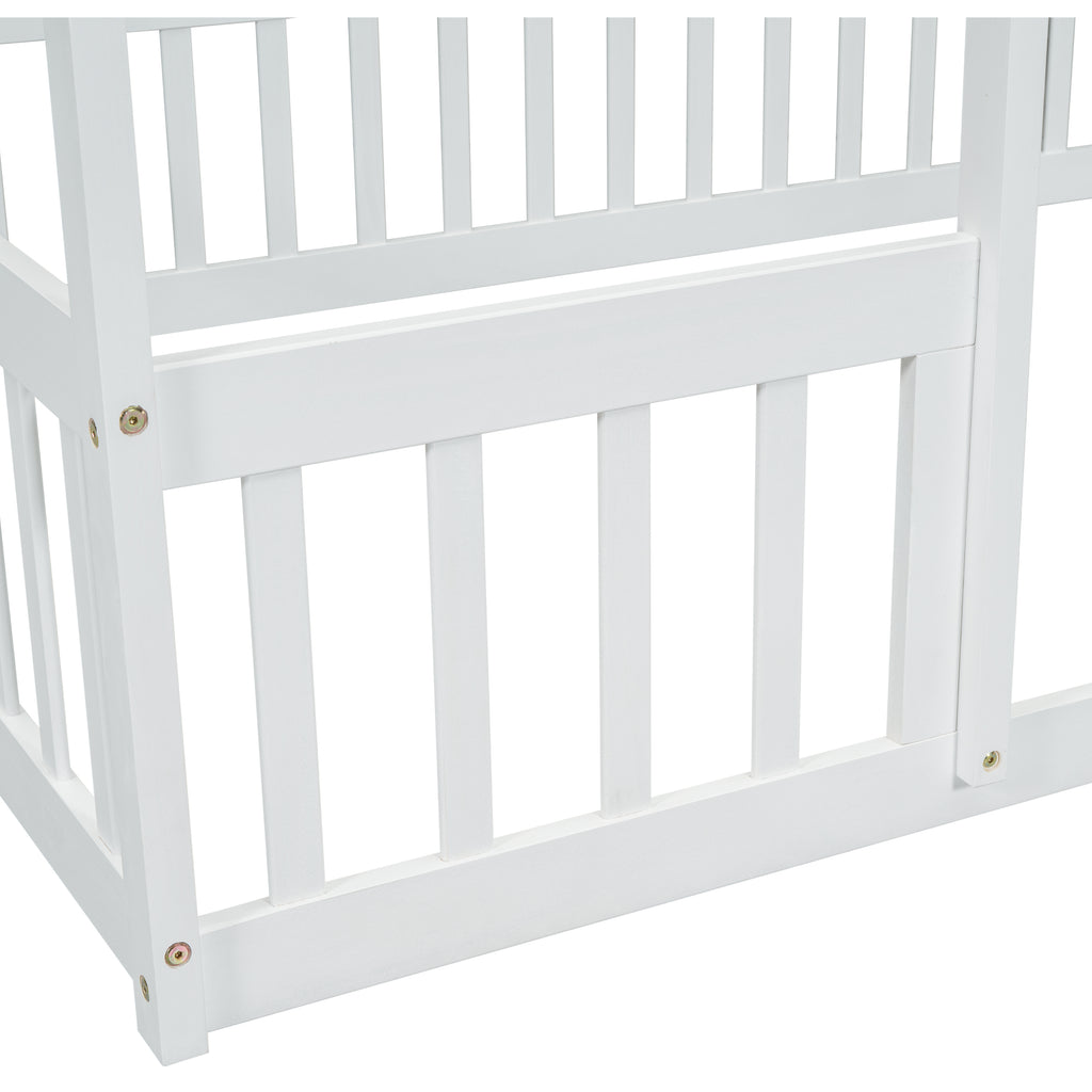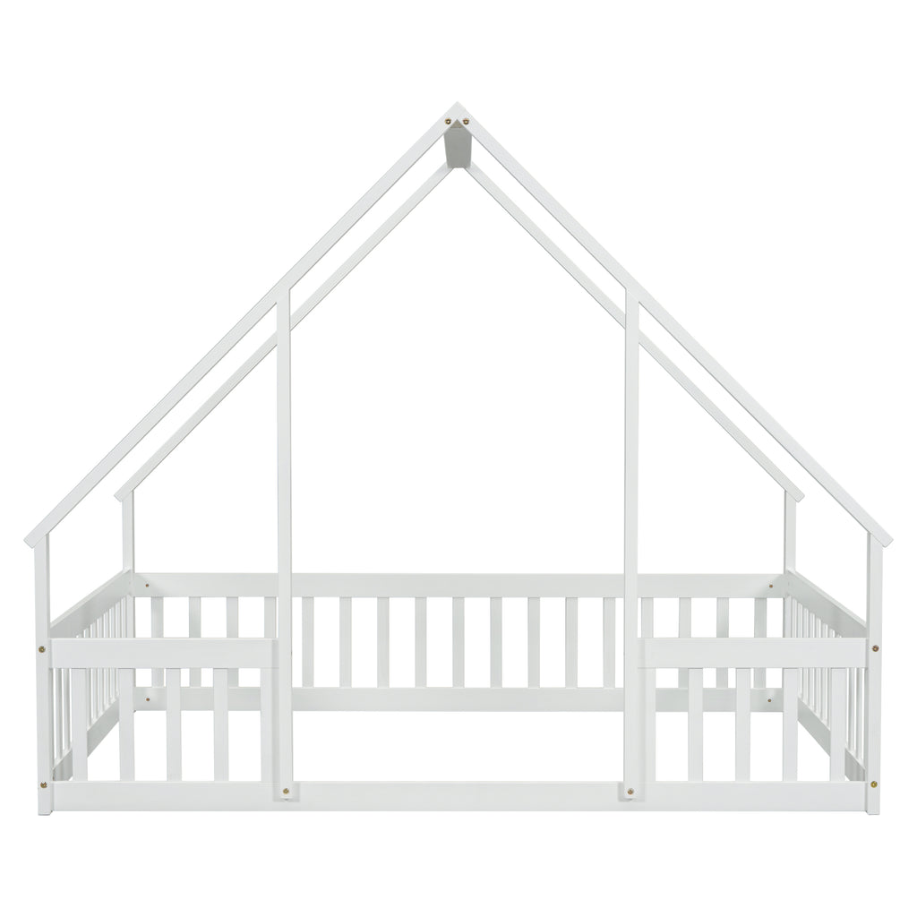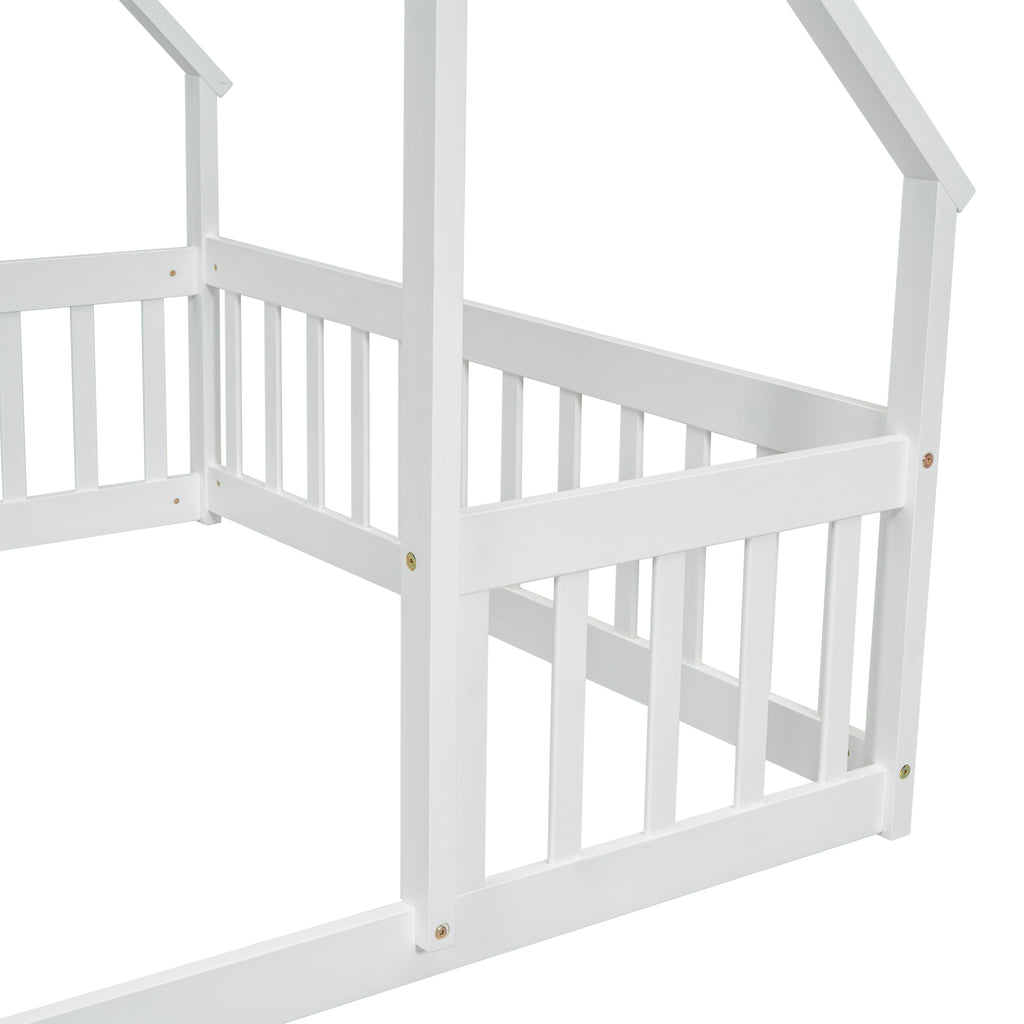 Full Wood House-Shaped Floor Bed with Fence, Guardrails