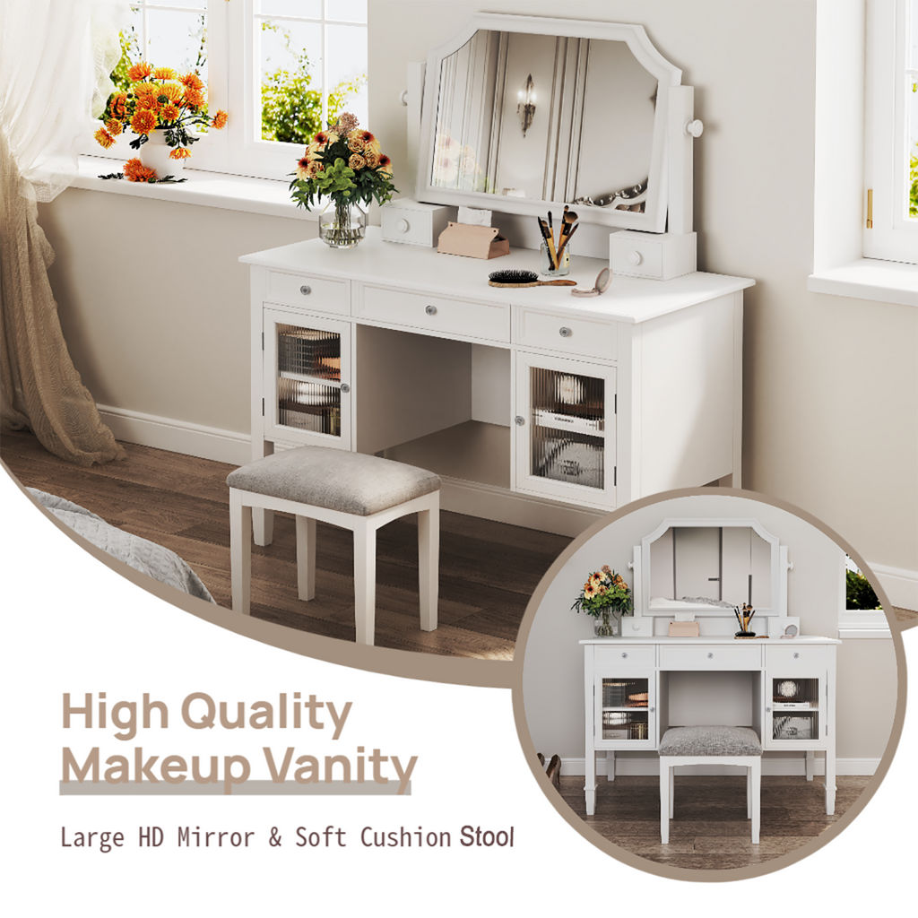 Elegant White Makeup Vanity Desk with Adjustable Mirror and Storage, MDF and Solid Wood Construction, 44.4'