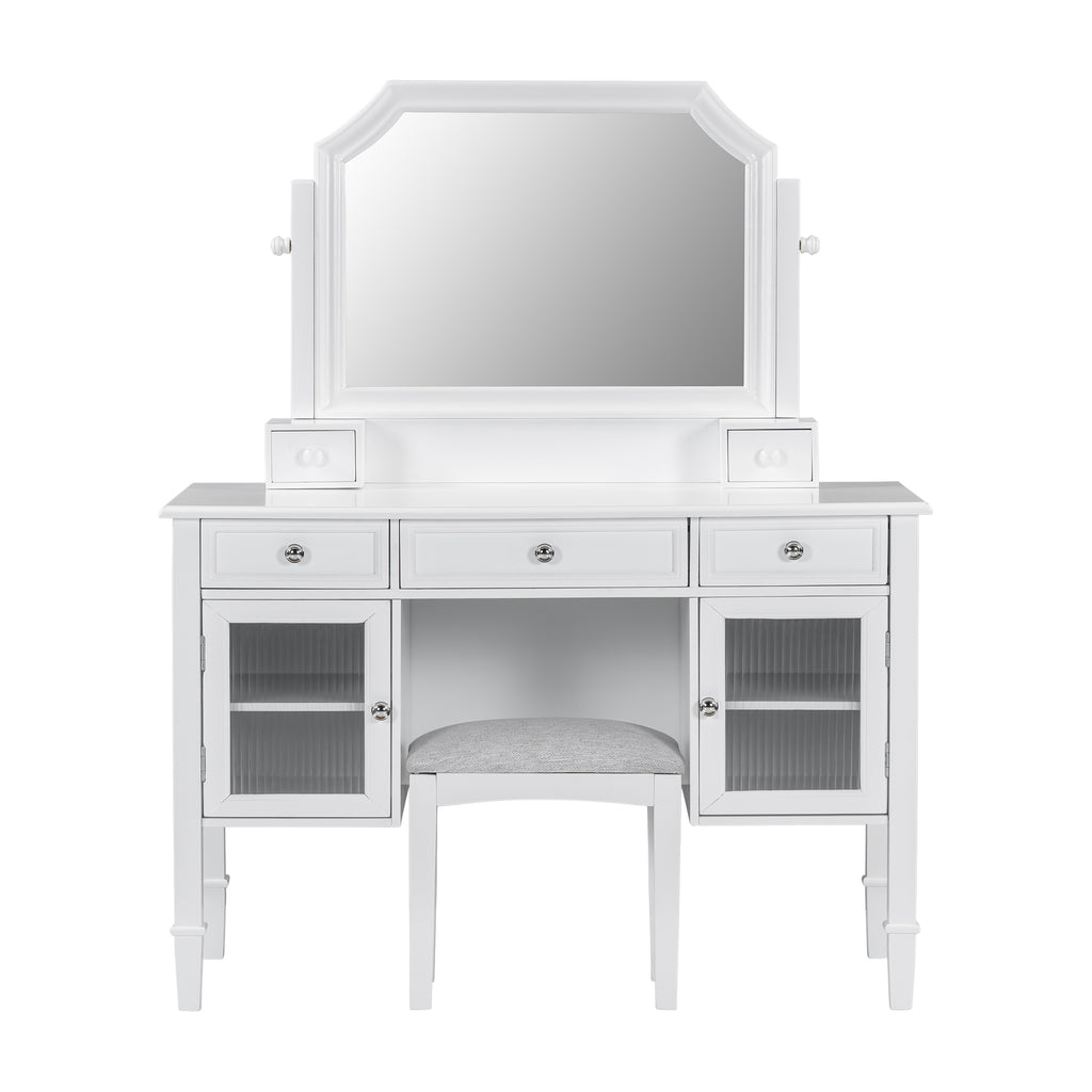 The vanity table is asterfully crafted from premium MDF material and solid wood, finished in an elegant white painting surface. Equipped with 5 drawers in different sizes, and two large cabinets with adjustable partitions, this vanity set is a perfect combination of style and functionality.
