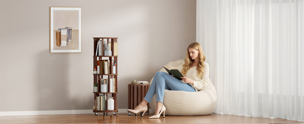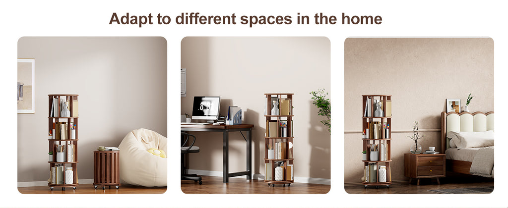 • 360° Safe Rotating Bookshelf: Our swivel bookshelf makes grabbing your favorite reads a breeze. With a gentle spin, your beloved books are right at your fingertips. What's more, keeping your family safe,it comes with lockable caster wheels, ensuring it stands firm even if your playful kids or energetic pets bump into it. With no worries, the easy-roll wheels allow you to effortlessly move the bookshelf to any room, like the bedroom, living room, playroom, or study room