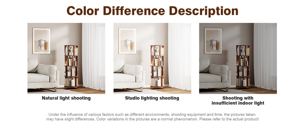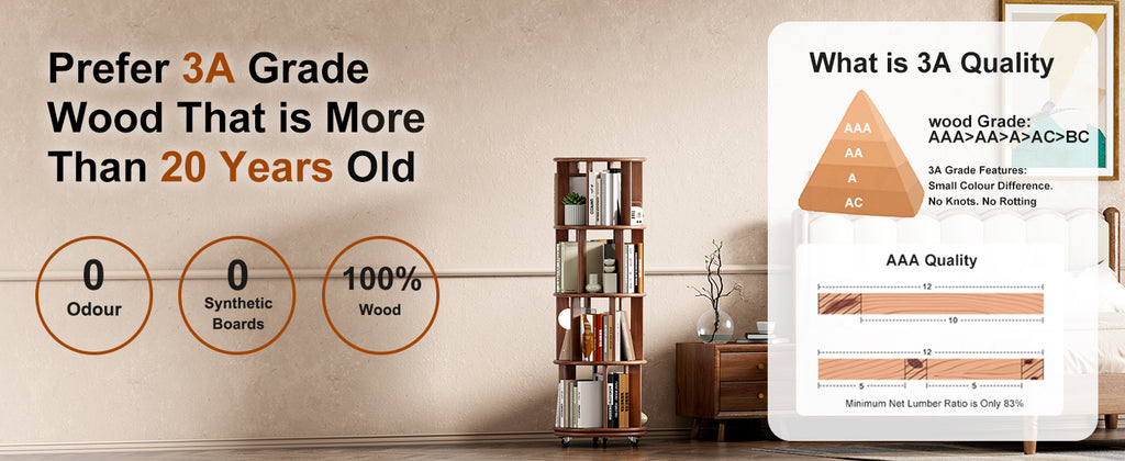 • 100% Natural Rubberwood - Built to Last: Our rotating bookshelf, crafted from eco-friendly and sturdy 100% natural rubber wood, has every inch of the wood carefully selected and polished, revealing the unique warm texture and delicate grain of natural rubber wood, offering you a dual sensory experience of sight and touch. Its modern white, walnut, and natural wood colors are not only aesthetically pleasing but also highly sturdy, adding a touch of elegance and beauty to your home