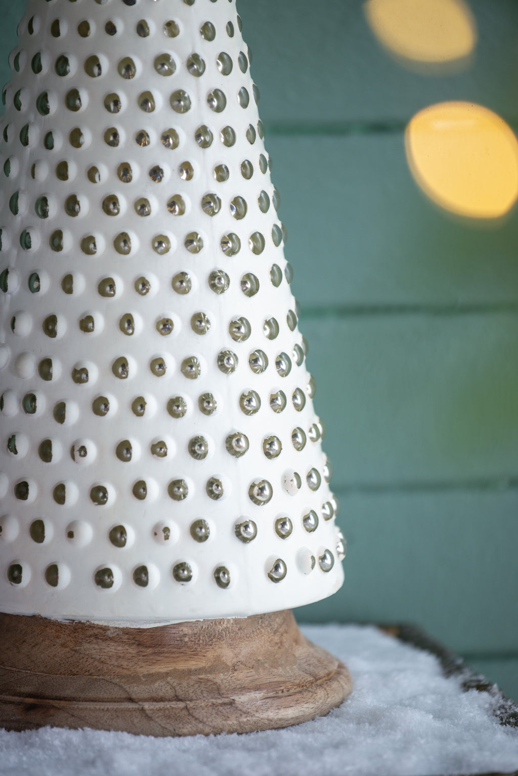 18″ Shimmery Cream Glass Tabletop Tree With Varied Textures And a Rustic Antiqued Wood Base