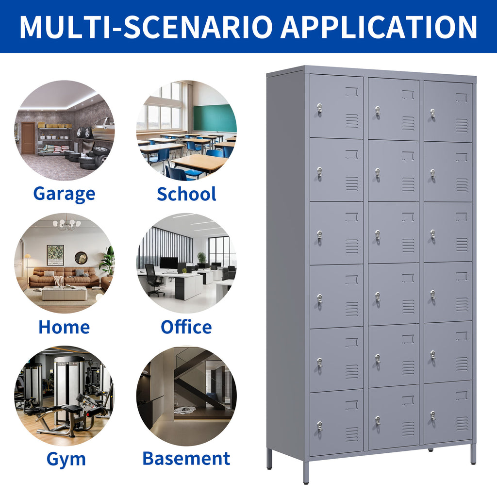 Discover the perfect storage solution with our 18 Door 72'H Metal Lockers! These lockers are designed for employees and suitable for various settings like home, gym, office, school, and garage. Made of high-quality steel, they offer spacious compartments to store clothes, shoes, and more. With individual locks on each door, your belongings will be securely stored. Transform your space into an organized haven with these versatile lockers.