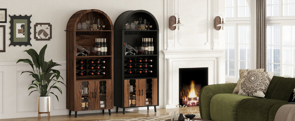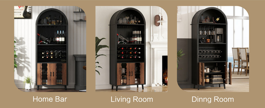 71'Farmhouse Arched Wine Bar Cabinet: tall arched display cabinet , arch black cabinets &coffee bar, whiskey station with wine rack and Wine Glass Holder - Liquor Bars Cabinet for Living Dining Room