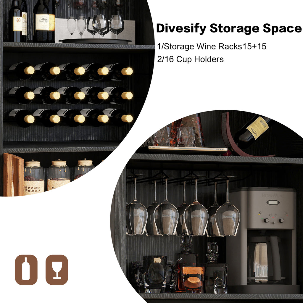 • Comprehensive Wine Storage & Display : With 15 wine racks and 16 glass holders, it neatly stores wines and hangs glasses. The tall cabinet offers vertical space for displaying glasses or decorations, making it perfect for creating a wine area.