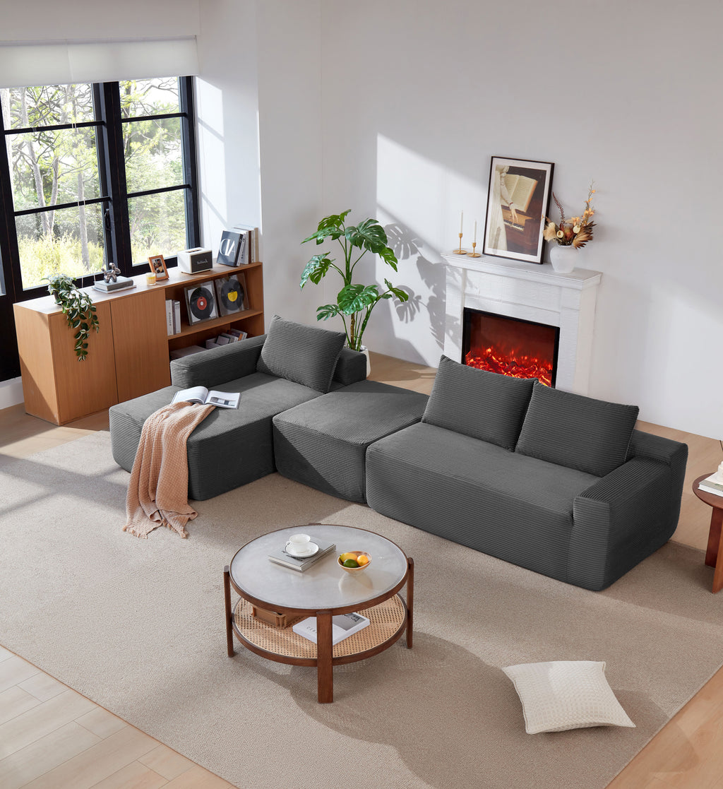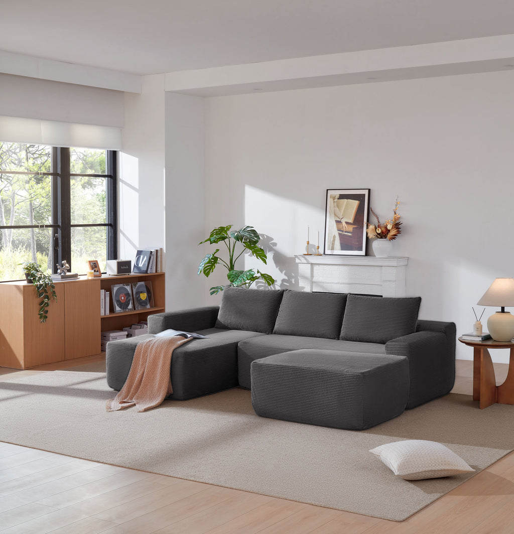 • Modular Sectional Sofa:This sectional sofa featuring a sleek design, clean lines, and high-quality plush corduroy Fabric,This sectional set maximizes space when placed against a wall,this corner sofa effortlessly adds a timeless and sophisticated touch to your home. Designed to be the focal point of attention, it's an ideal choice for elevating the ambiance of living rooms, apartments, and bedrooms.