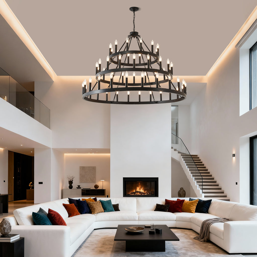 3 Tiers Wagon Wheel Chandelier Farmhouse 54-Light(24+18+12) , Black Metal Chandeliers 3-Story Light Fixtures Industrial for High Ceiling Living Dining Room Foyer. Adjustable Height-E12