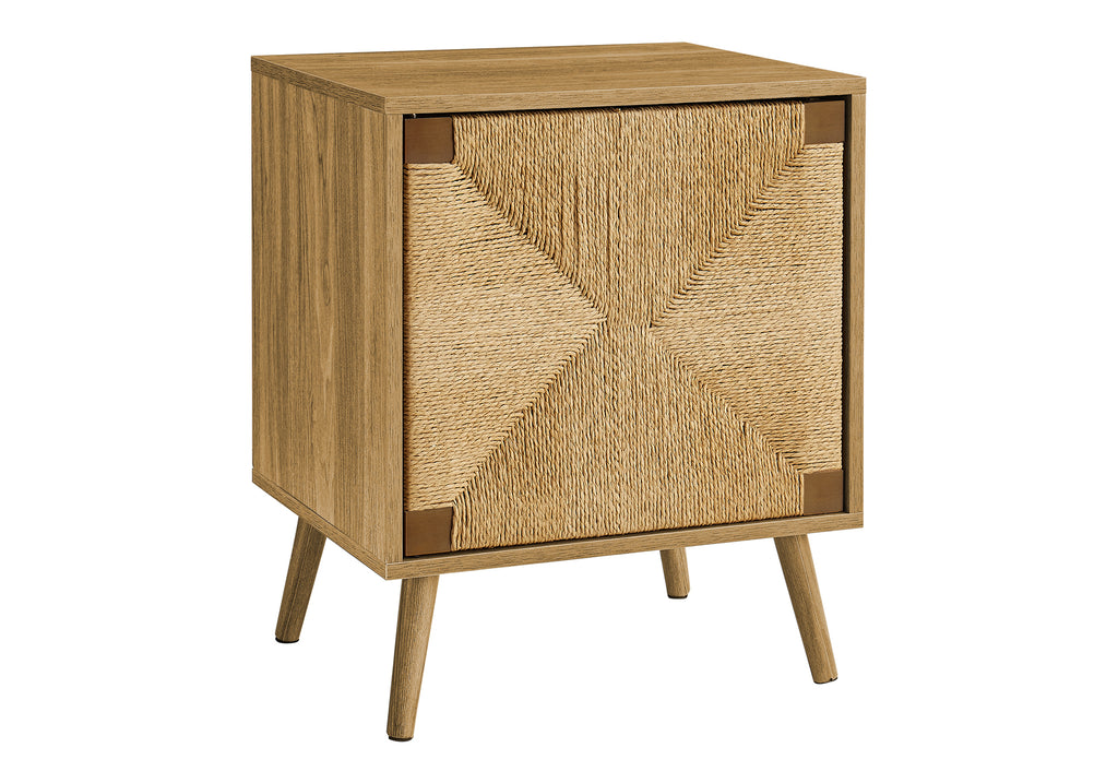 • Modern, mid-century inspired 23 inch high side accent table in a trendy light walnut laminate finish and complimented with a hand-crafted, natural seagrass door, bringing fashionable style to your living room.