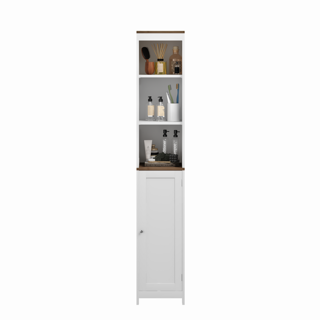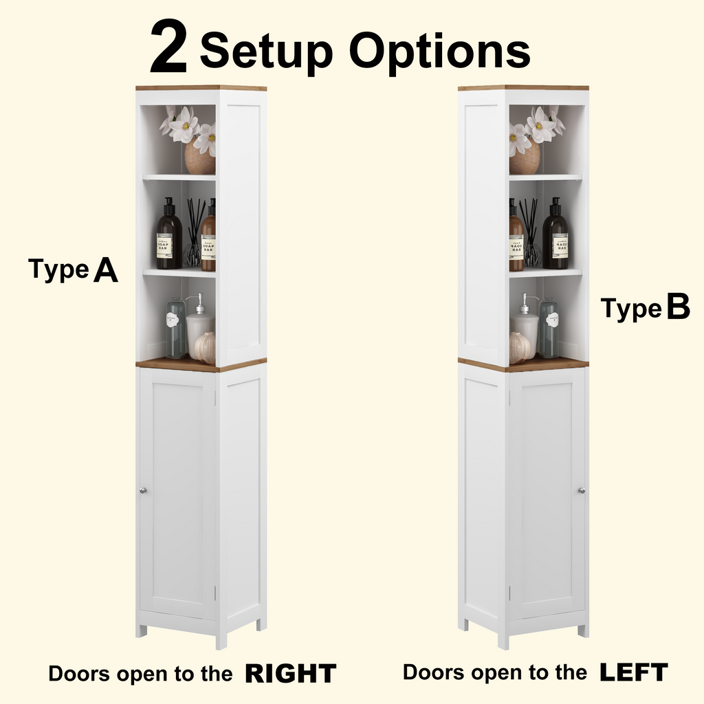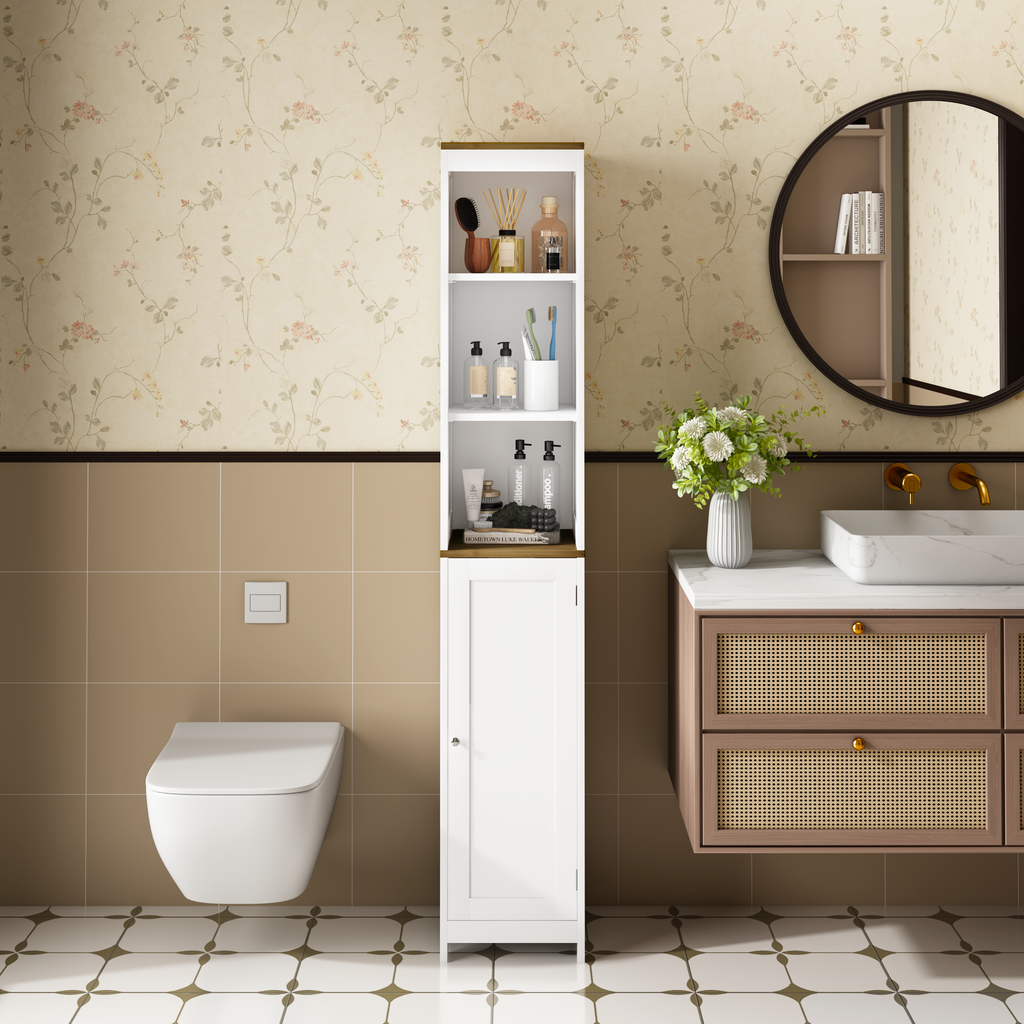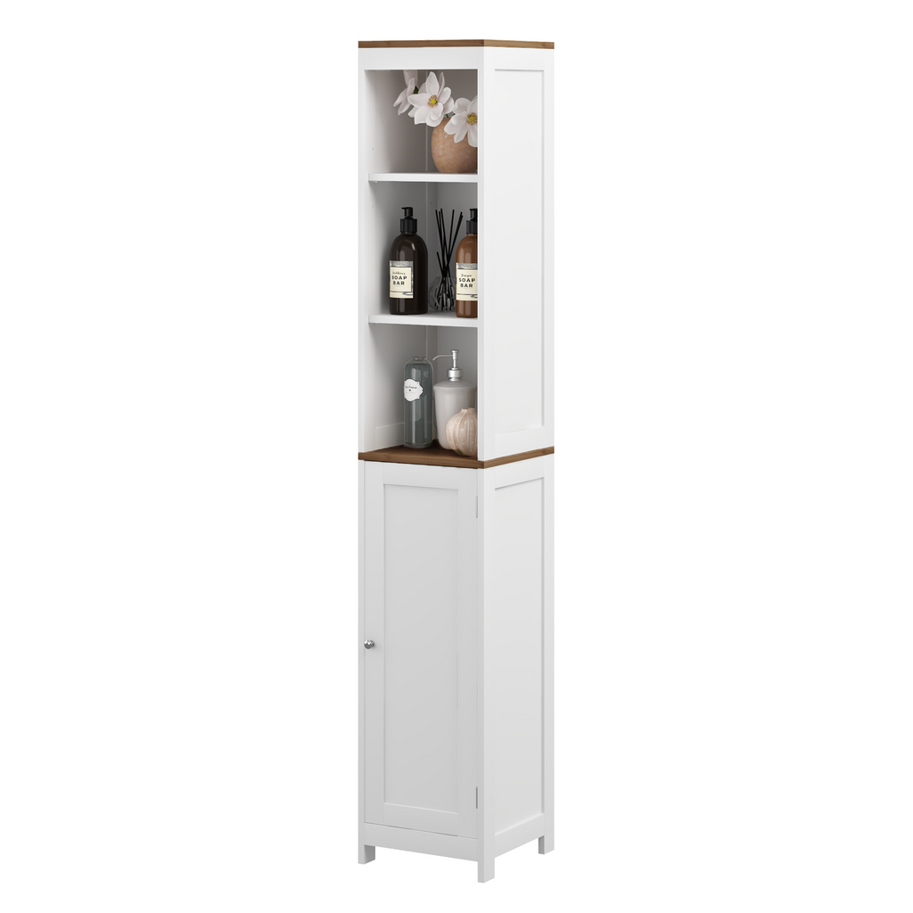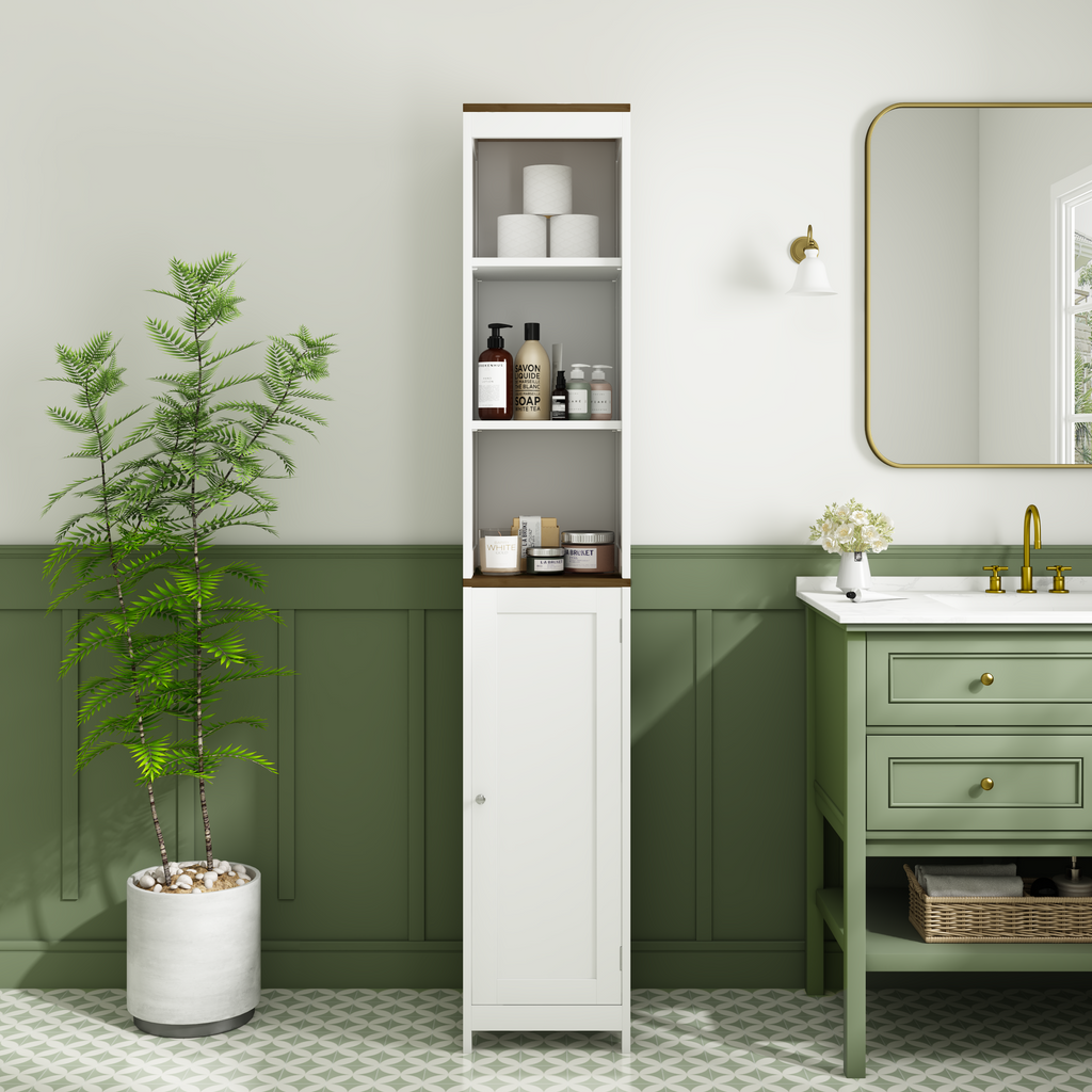 Tall Bathroom Storage Cabinet with Reversible Door, Freestanding Linen Tower with Open Shelves and Enclosed Cabinet, Narrow Floor Cabinet Organizer for Bathroom, Laundry Room or Small Spaces – White