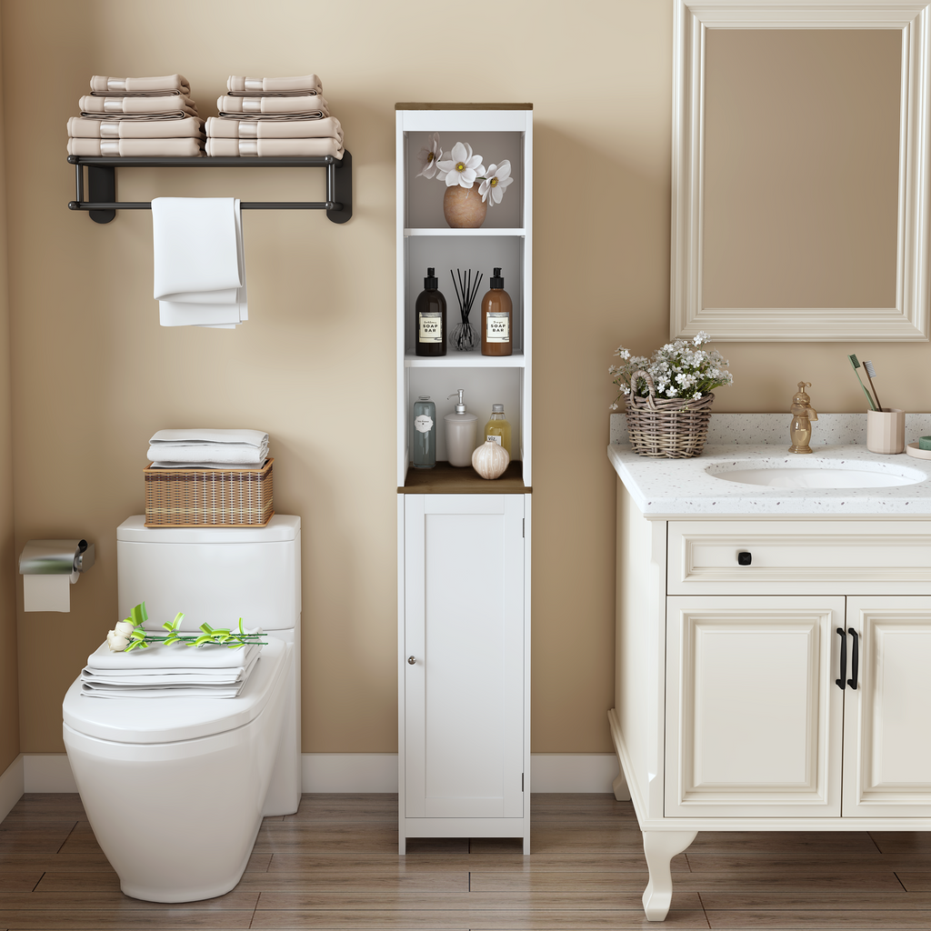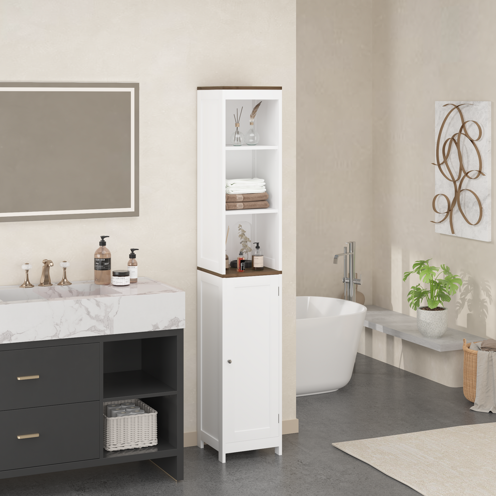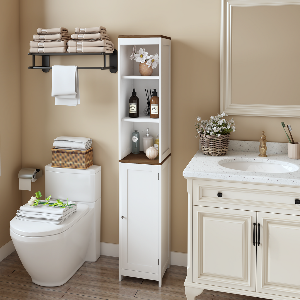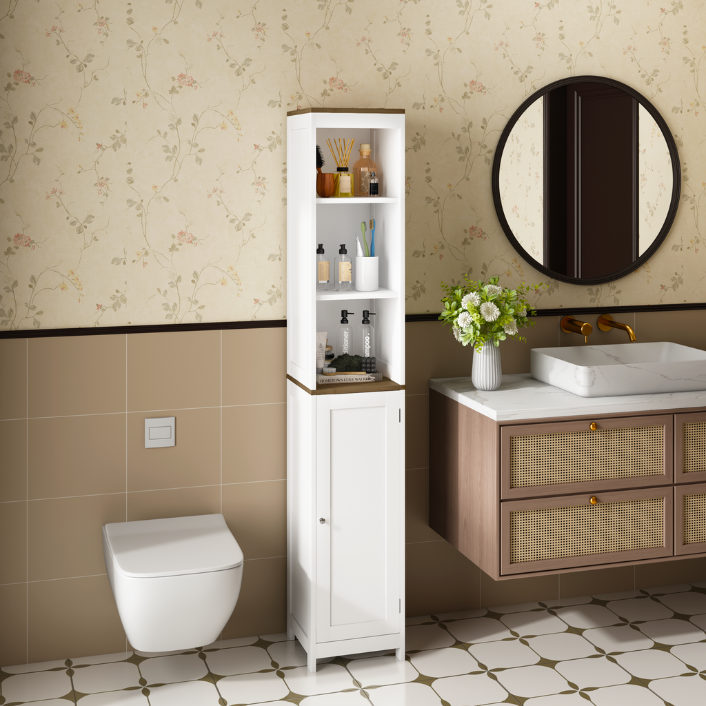 Tall Bathroom Storage Cabinet with Reversible Door, Freestanding Linen Tower with Open Shelves and Enclosed Cabinet, Narrow Floor Cabinet Organizer for Bathroom, Laundry Room or Small Spaces – White