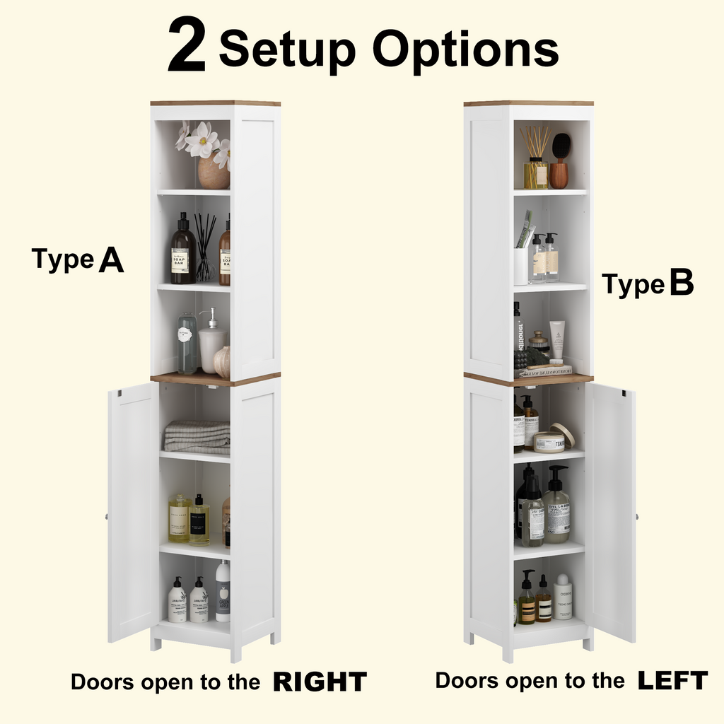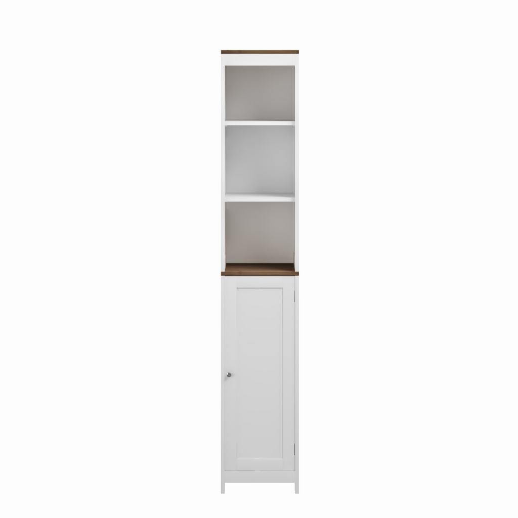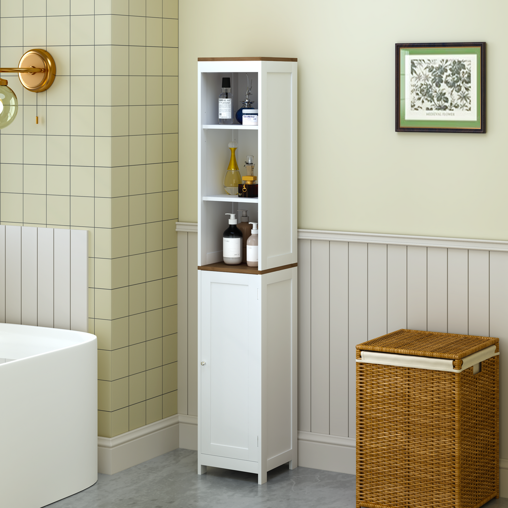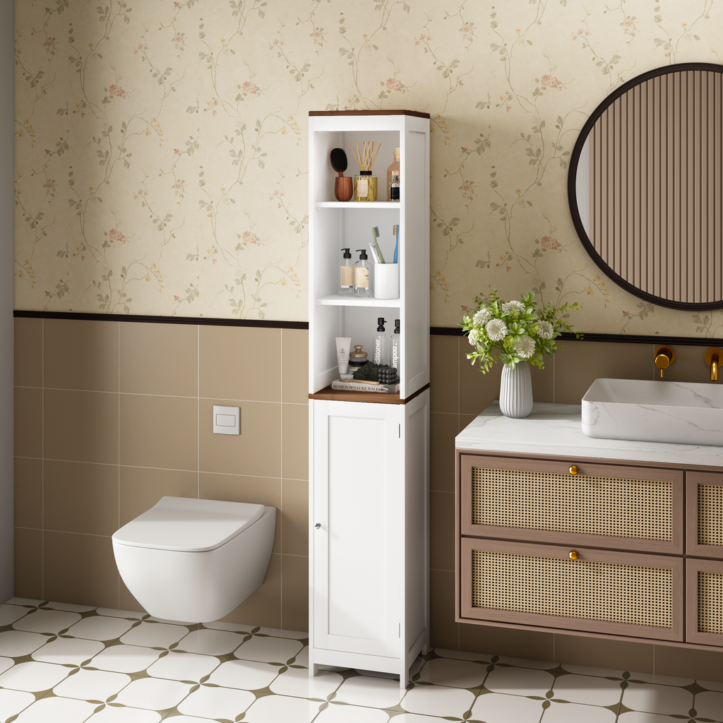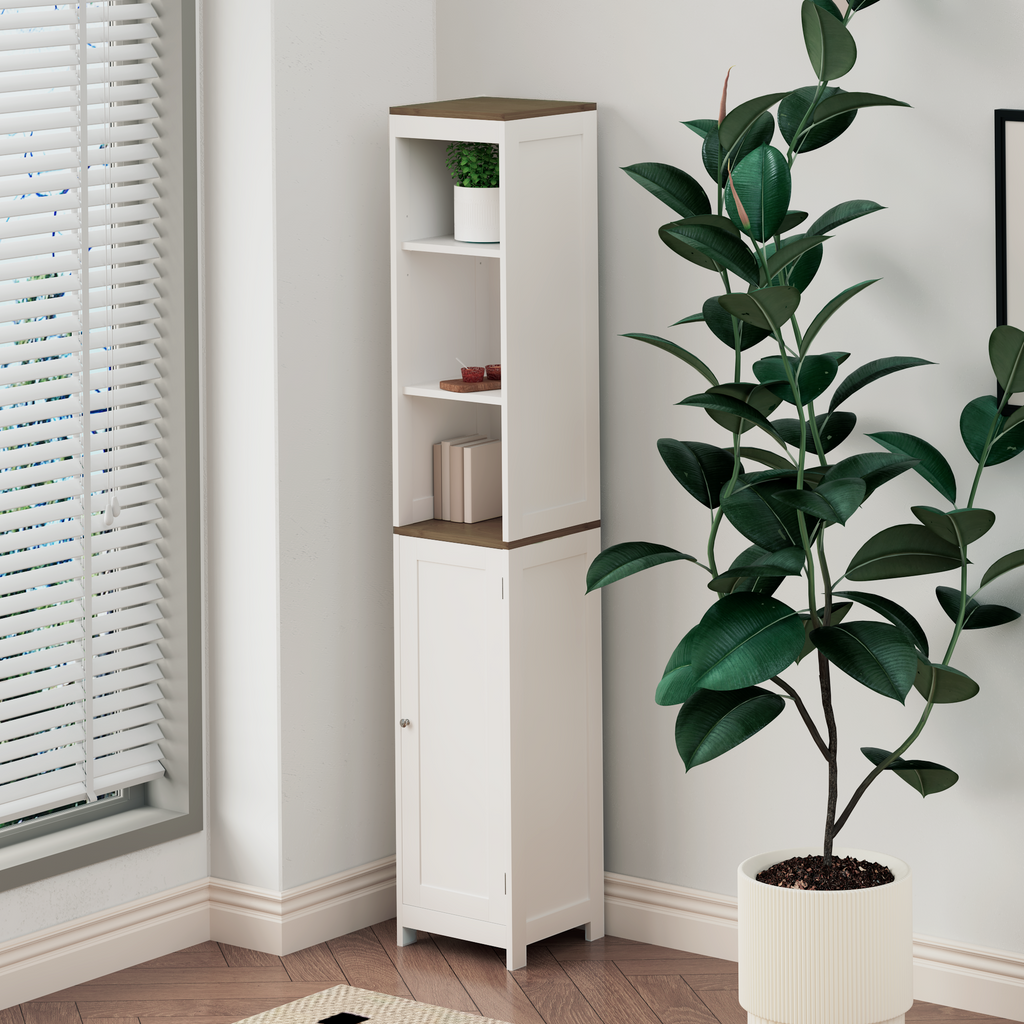 Tall Bathroom Storage Cabinet with Reversible Door, Freestanding Linen Tower with Open Shelves and Enclosed Cabinet, Narrow Floor Cabinet Organizer for Bathroom, Laundry Room or Small Spaces – White