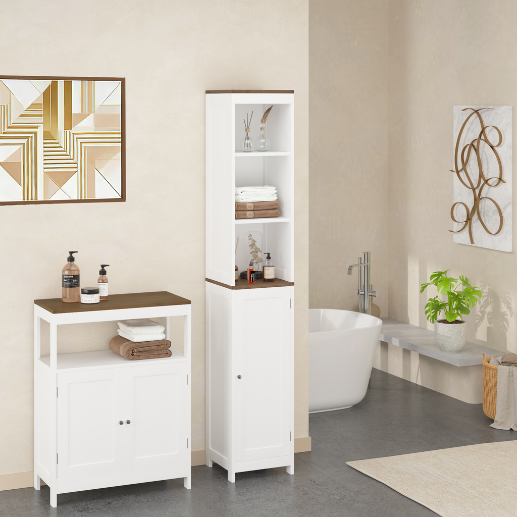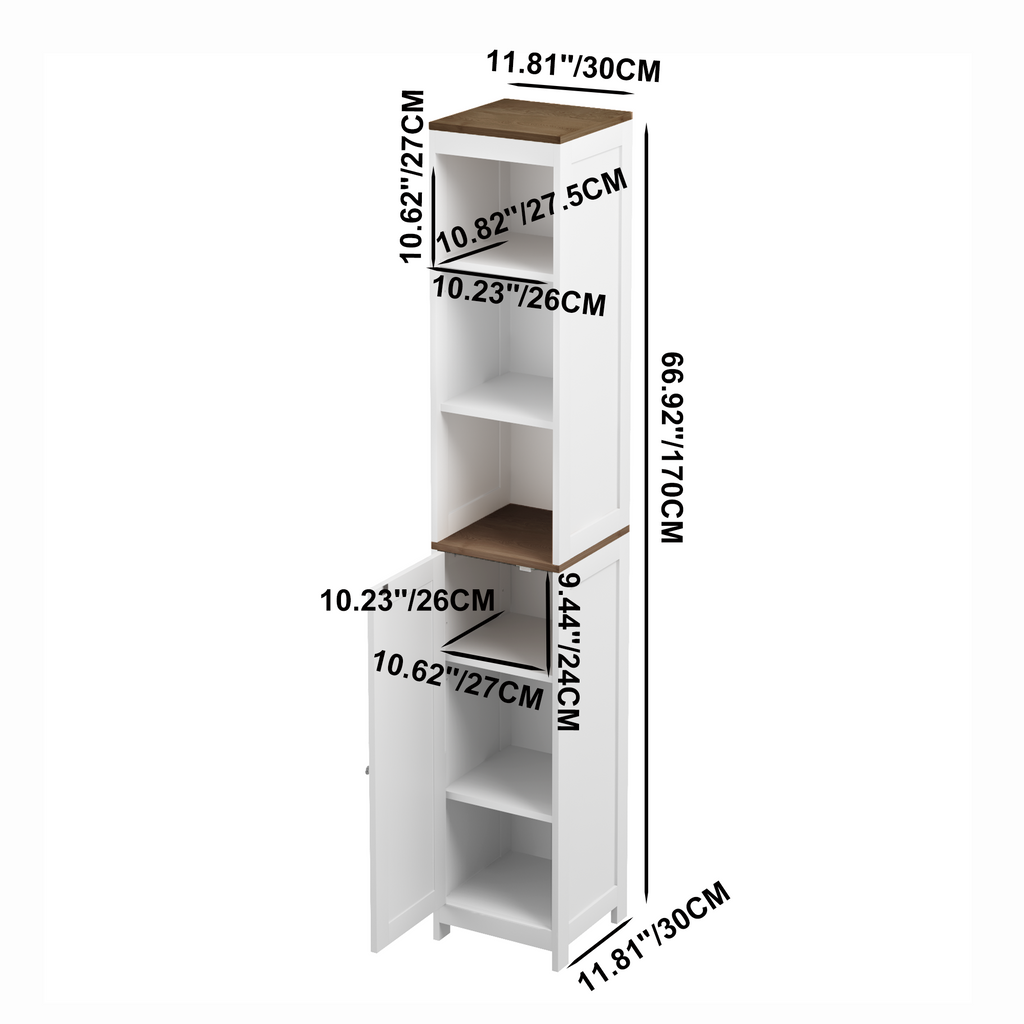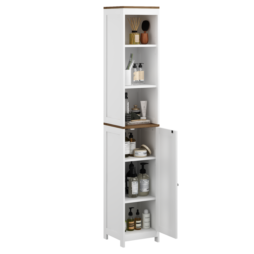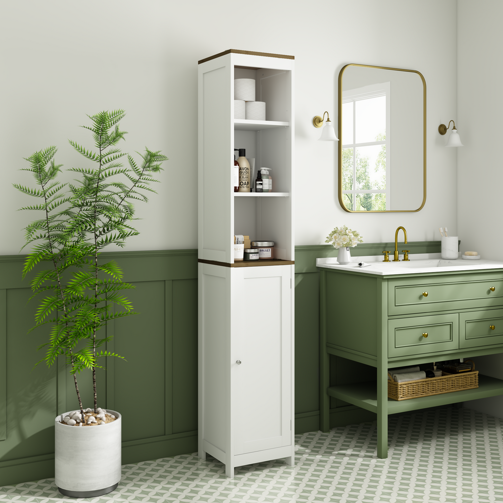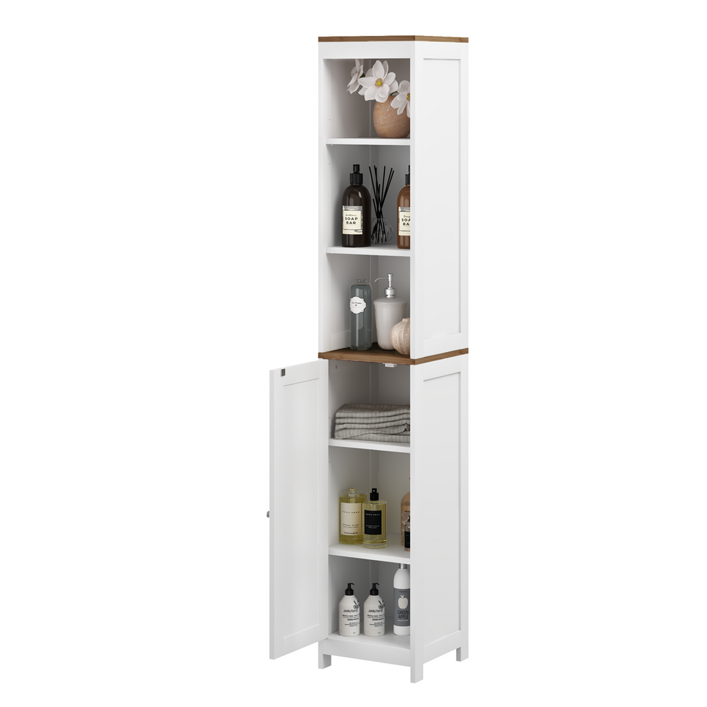 Tall Bathroom Storage Cabinet with Reversible Door, Freestanding Linen Tower with Open Shelves and Enclosed Cabinet, Narrow Floor Cabinet Organizer for Bathroom, Laundry Room or Small Spaces – White