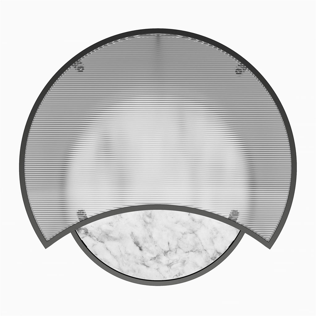 - Unique design reveals the phases of the moon looking through the fluted crescent table top down to the rounded faux marble table top below.