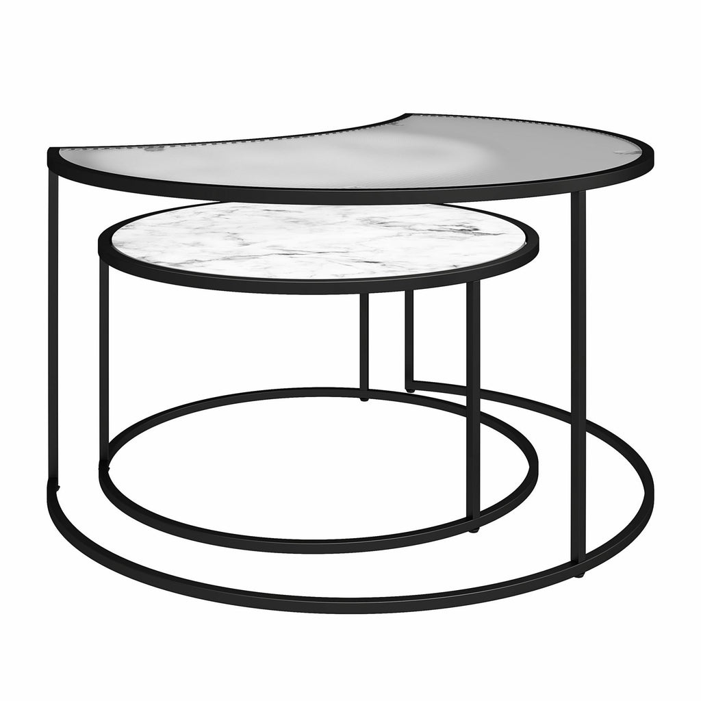 - Featuring 2 delicate black framed coffee tables with elegant fluted glass top above, revealing a contemporary soft faux marble top below.