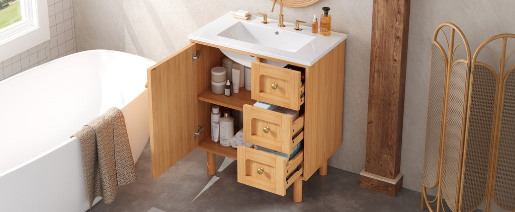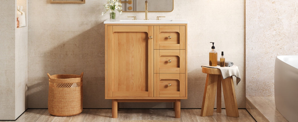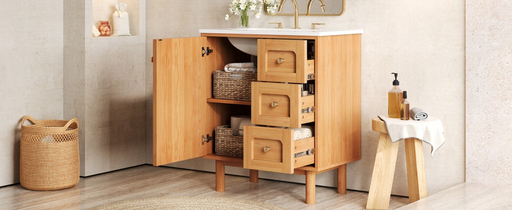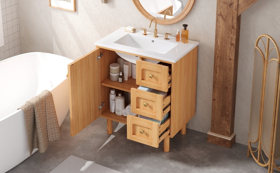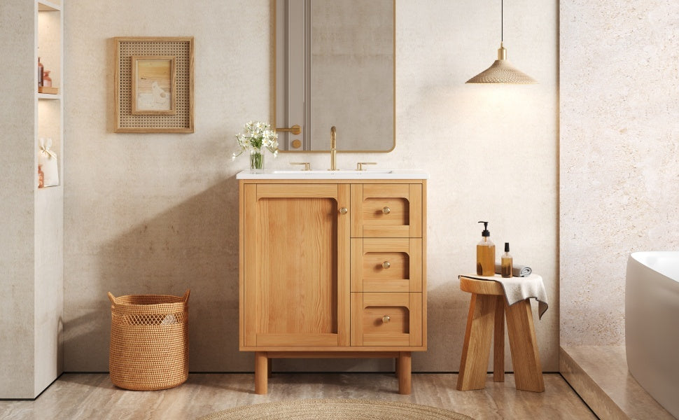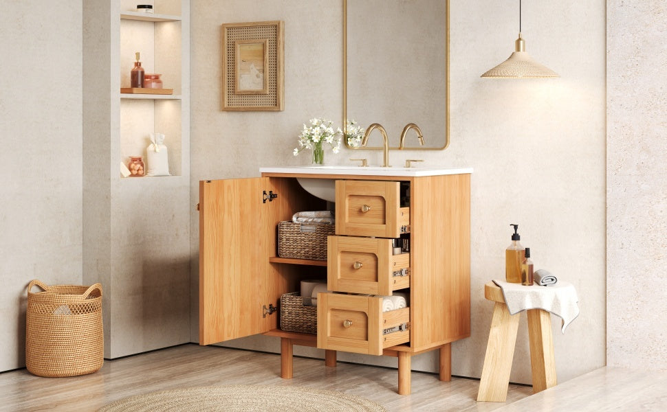 This 30-inch bathroom cabinet perfectly combines elegant design with practical functions to create a comfortable and convenient bathroom space for you. Selected high-quality ceramic basins are smooth and easy to clean, stain-resistant and wear-resistant, and timeless; matched with environmentally friendly and moisture-proof high-quality panels, they are sturdy, stable and have a long service life. Three large-capacity drawers can be used to classify and store toiletries, cleaning tools, etc. to keep the countertop clean. The simple and fashionable appearance design can be easily matched with various bathroom styles; high-quality hardware accessories are smooth, quiet and durable. The 30-inch golden size is suitable for most house types, saving space without losing practicality.