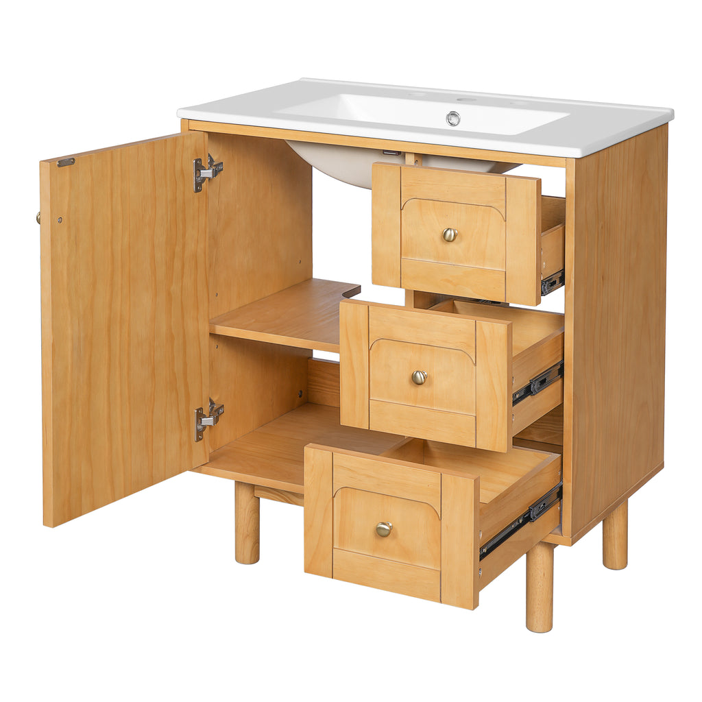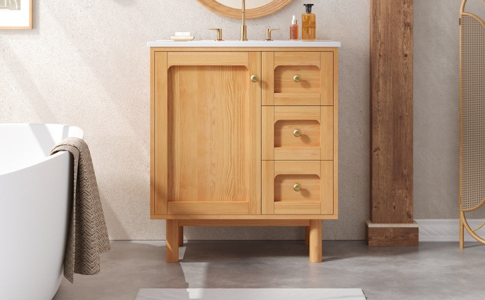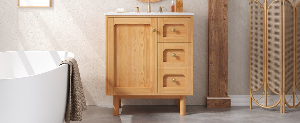 This 30-inch vanity with countertop features a stain-resistant and maintenance-free white ceramic countertop, adding a touch of elegance and is an ideal choice for a bathroom vanity with sink.