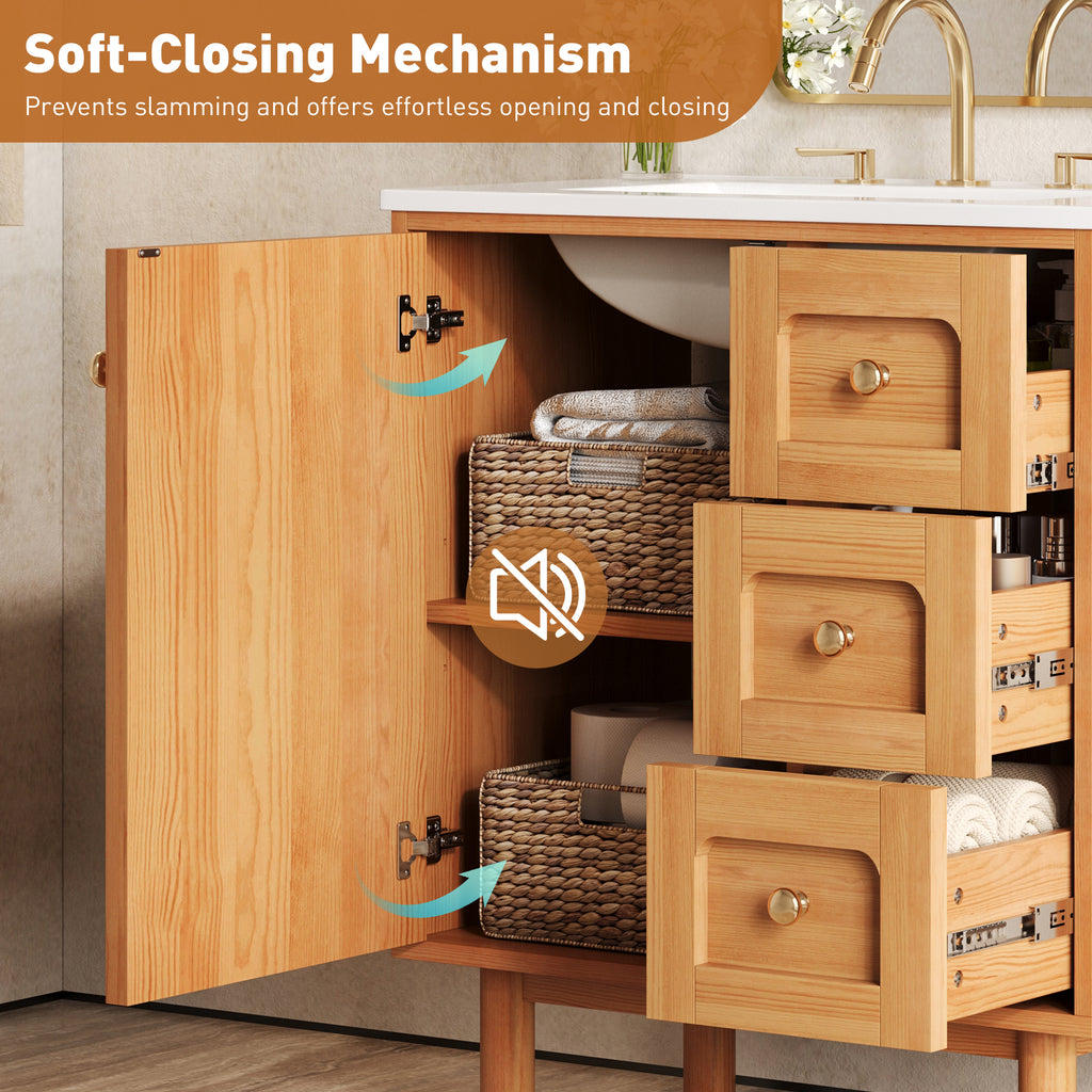 - [Soft-Close Feature] This bathroom vanity features soft-close doors and full-extension drawers to ensure quiet and smooth operation for all bathroom sink vanity needs.