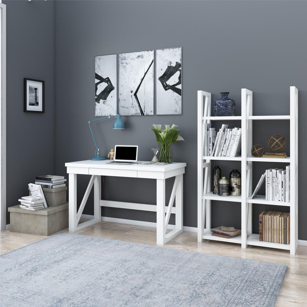 Practical meets attractive with the Crestwood Computer Desk. This beautiful piece features an airy desktop to hold your laptop and office supplies as well as a small drawer to keep your space clutter-free. Made of painted MDF, the Desk features a white finish with a gray rub through for a rustic look and pairs well with any style and décor. The Desk ships flat to your door and requires assembly upon opening. The preassembled desktop makes assembly quick and easy. Once assembled, the Desk measures to be 30'H x 47.48'W x 23.5'D.