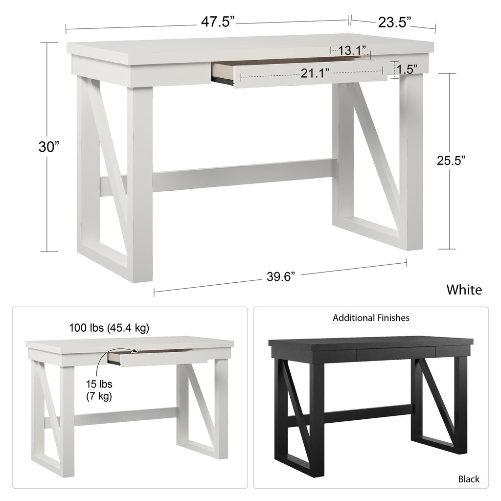 - The Desk ships flat to your door and requires assembly upon opening. The preassembled desktop makes assembly quick and easy. The desktop can hold up to 100 lbs. while the drawer will hold 15 lbs. Assembled dimensions: 30'H x 47.48'W x 23.5'