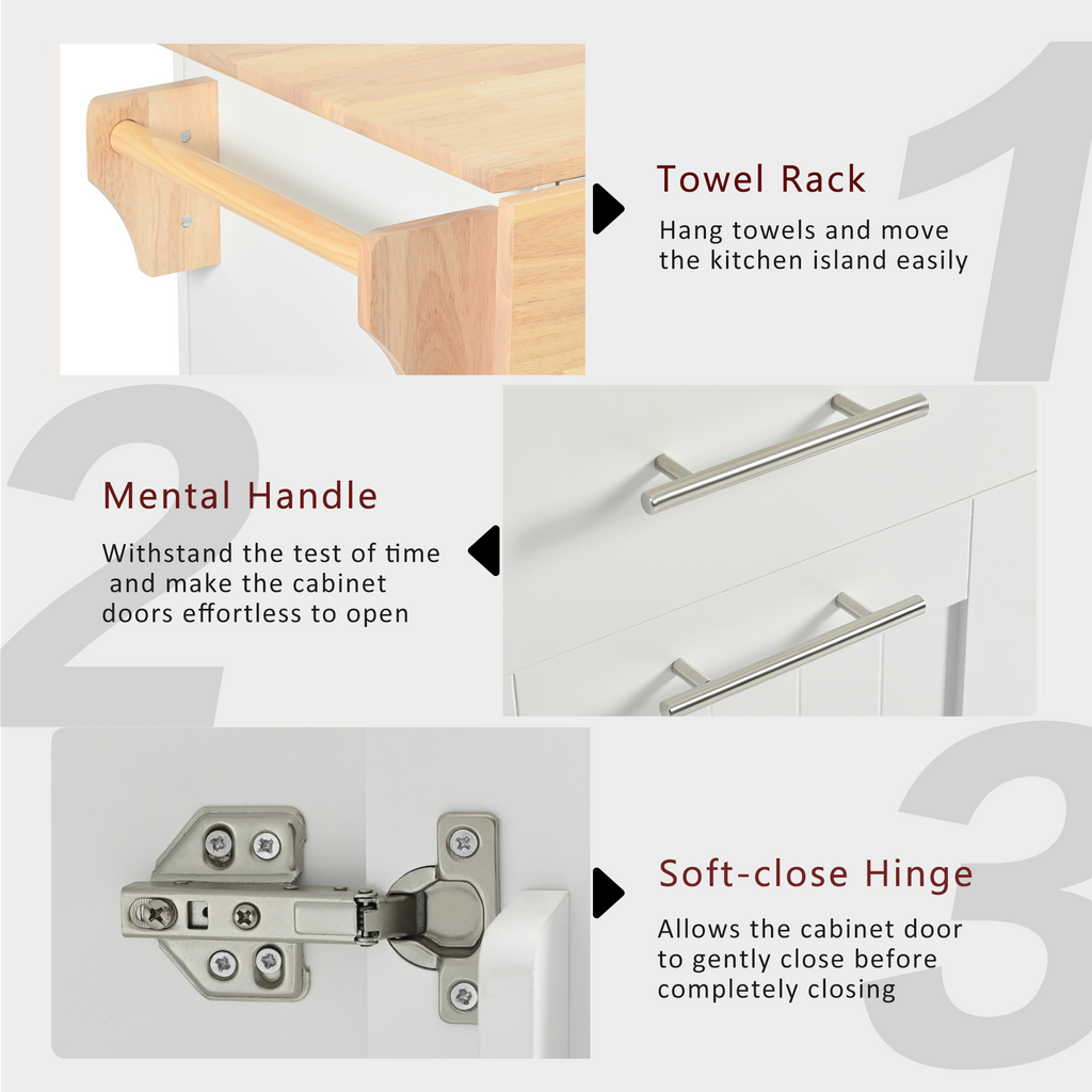 The table and the towel rack are crafted from smooth rubber wood, and this kitchen island with storage offers exceptional stability and durability.