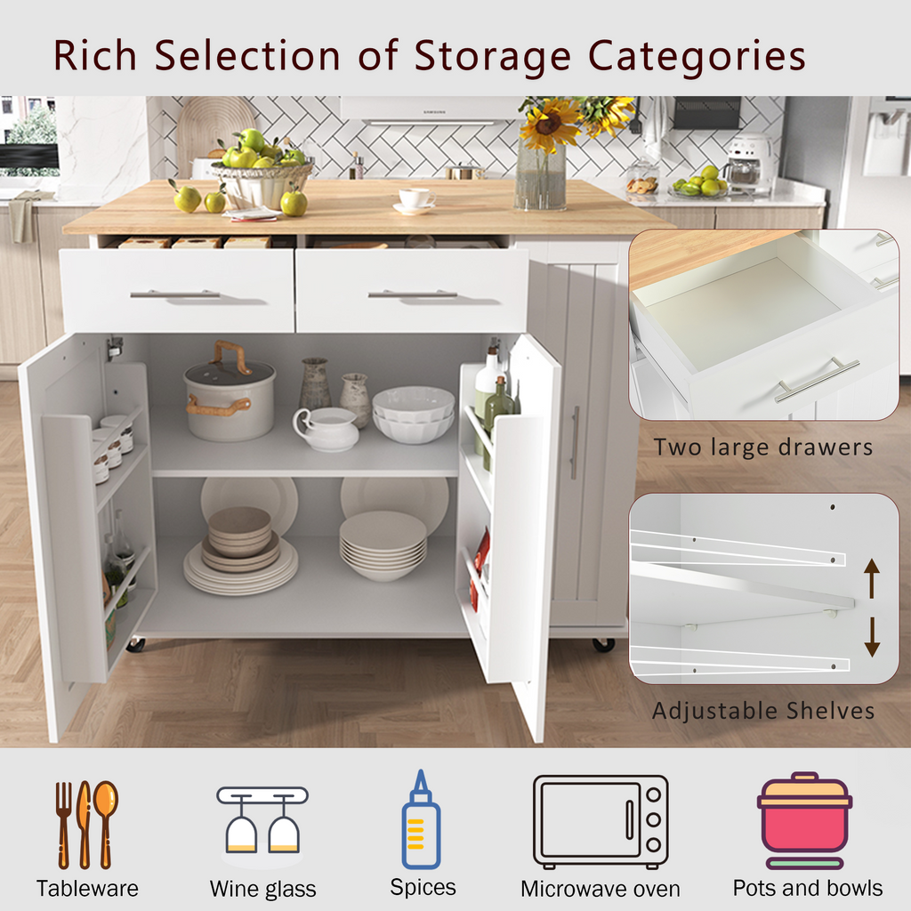 | Highlights | [Ample Storage Space][Drop Leaf] [Two Doors + Two Drawers][Adjustable Shelves] [Internal Storage Racks][3 Tier Pull Out Cabinet Organizer] [5*360°Smooth Rotation Wheels with 2 Lockable] [Towel Rack][Metal Handle][Metal Hinge] [Eco-friendly manufactured MDF][Rubber Wood Countertop] |