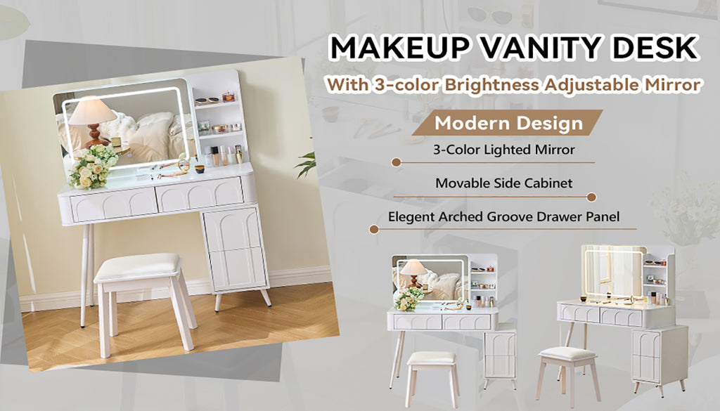 • 3-Color Lighted Mirror for Perfect Illumination: The vanity table includes a high-definition mirror with three LED light options: warm, cool, and natural. Simply touch the screen switch to illuminate your beauty routine as needed. This feature provides bright and even lighting, ensuring a flawless makeup application every time. The adjustable brightness allows you to customize the lighting to your preference, making it ideal for any lighting condition.