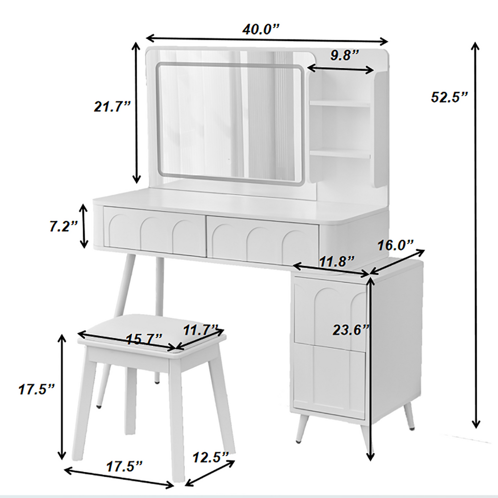 Included with the vanity desk is a ergonomic stool. lts solid woodlegs,soft,seat with PU cover and inserted 2.0' foam pad ensure opti-mal comfort during daily makeup routine.