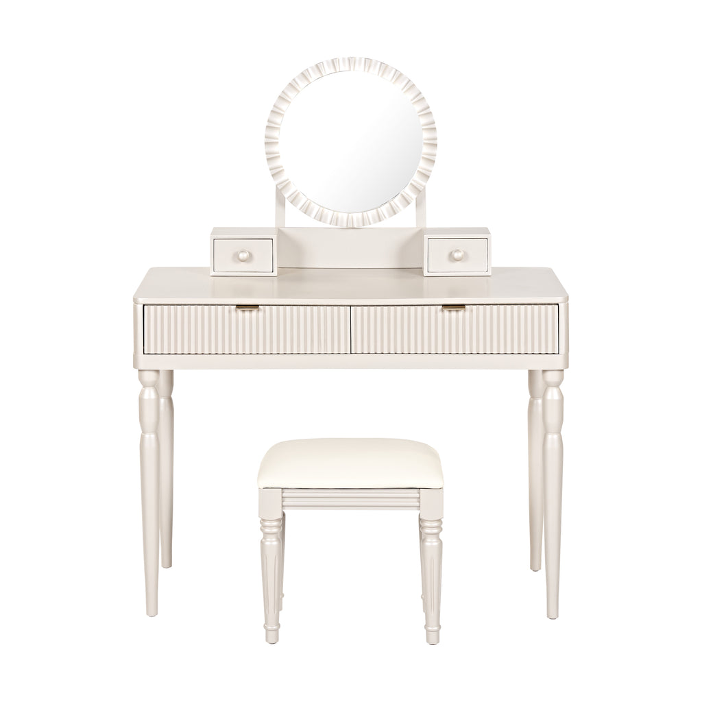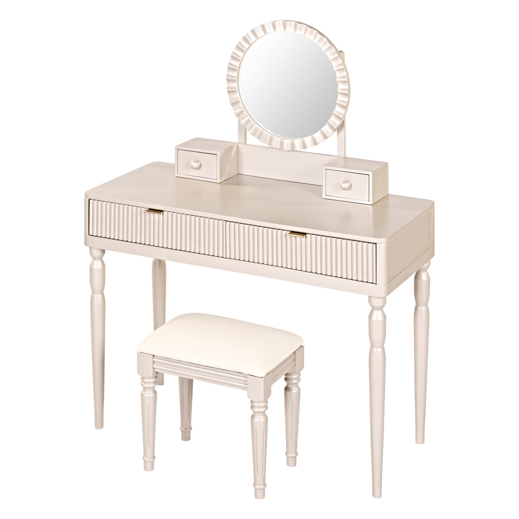This makeup table seamlessly blends classic and modern aesthetics, featuring a sunflower-shaped mirror, strip-fluted drawer panels, and delicately carved table and stool legs, appealing to any room decor.