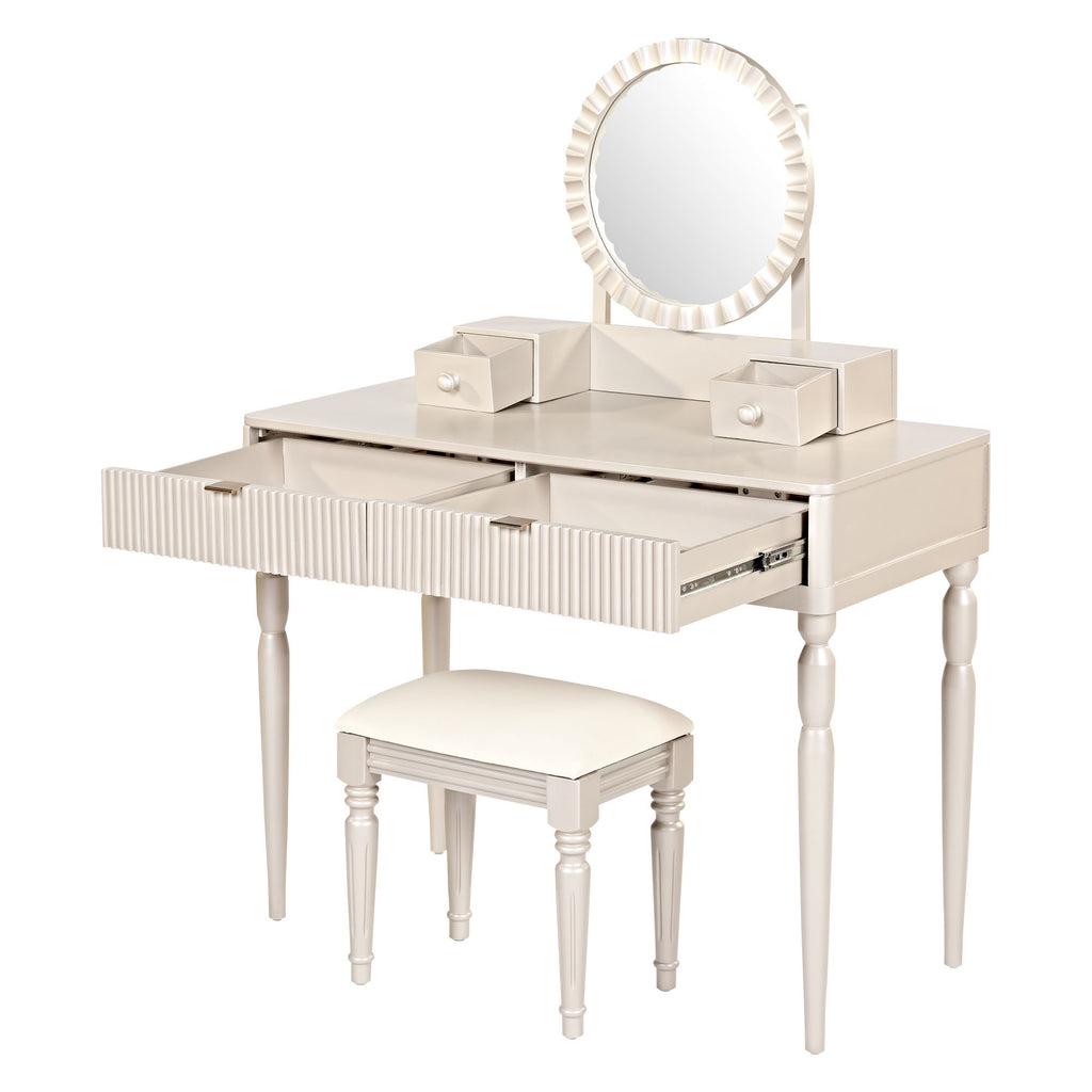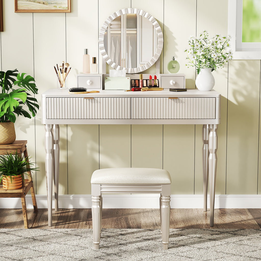 - Elegant Design with Timeless Appeal: This makeup table seamlessly blends classic and modern aesthetics, featuring a sunflower-shaped mirror, strip-fluted drawer panels, and delicately carved table and stool legs. Its simple yet stylish design adds a touch of grace and elegance to any bedroom, making it an ideal choice for those who appreciate refined and classic decor.