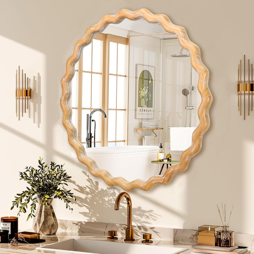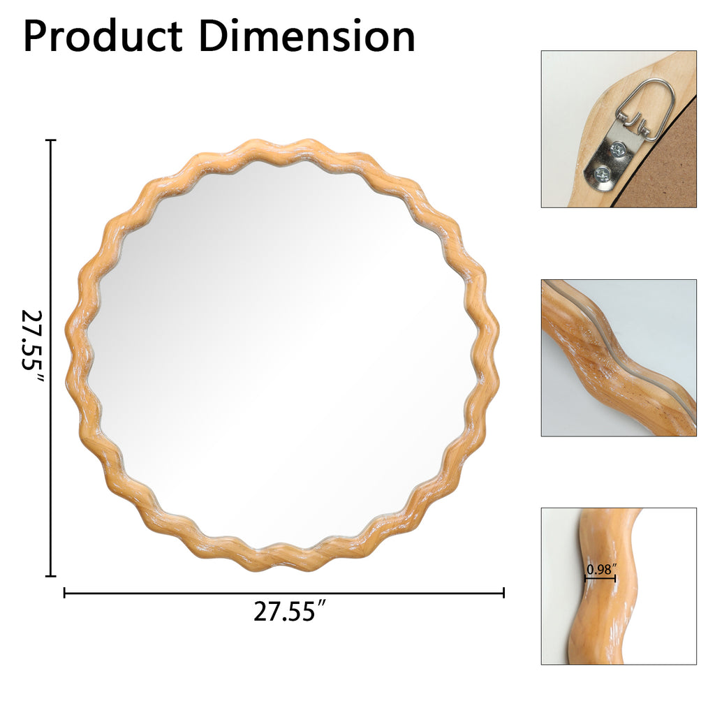 27.5 inches Round wavy Wall Mirror for Bathroom Vanity, Wooden Farmhouse Circle Mirrors for Bedroom, Entryway, Living Room, Kithen Whitewash Edge Decorative Mirror for Home, Office