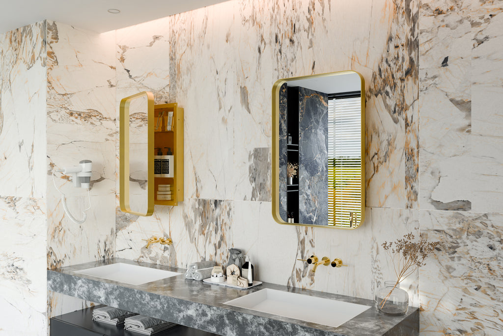 The metal framed medicine cabinet with mirror seamlessly combines the aesthetic and practicality of metallic luster, enhancing the taste of the bathroom. Fashionable design and unique metal finishes add a touch of elegance to your bathroom.