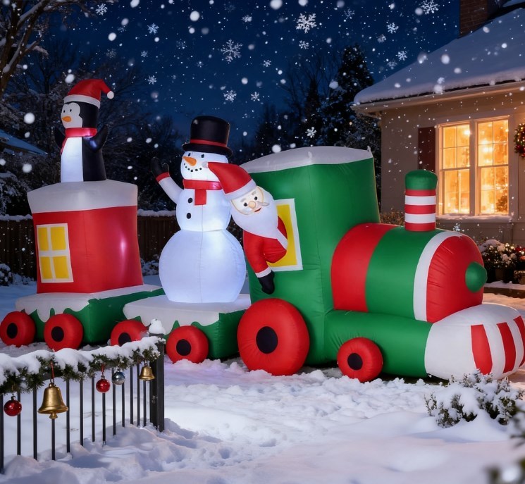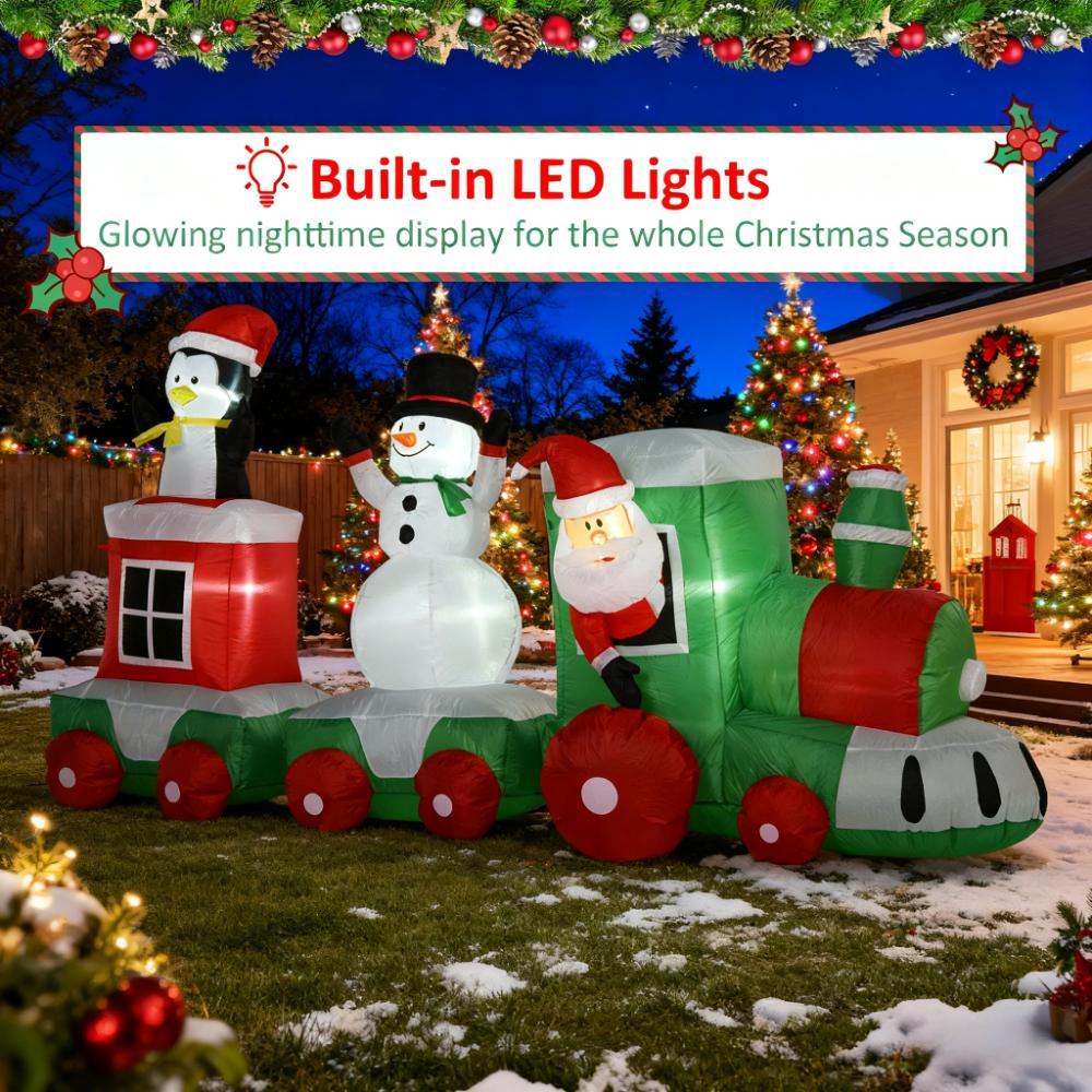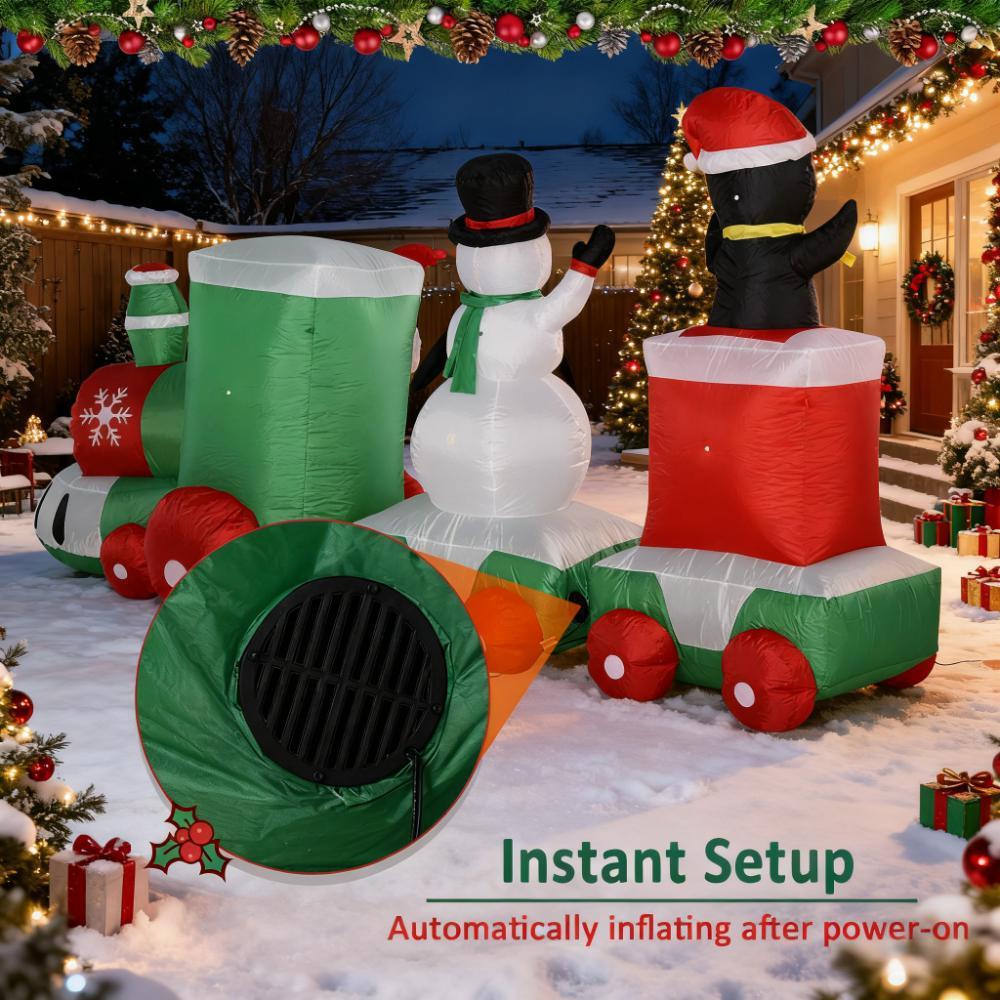 - - Cute Holiday Fun: This 11ft long inflatable Christmas train features joyous Santa as the train conductor, a festive penguin, and a smiling snowman, waving hands and welcoming guests. It is a great addition to your festival yard for Christmas parties and events.