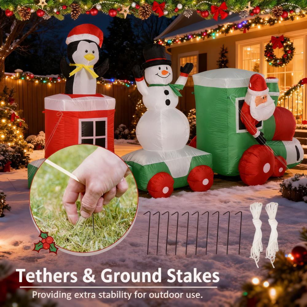 - - Hardware/Accessories: This Christmas inflatable comes with 1 built-in air blower, 9.8'power cable, 2 tethers, and 10 ground stakes included to keep the inflatable train stable.