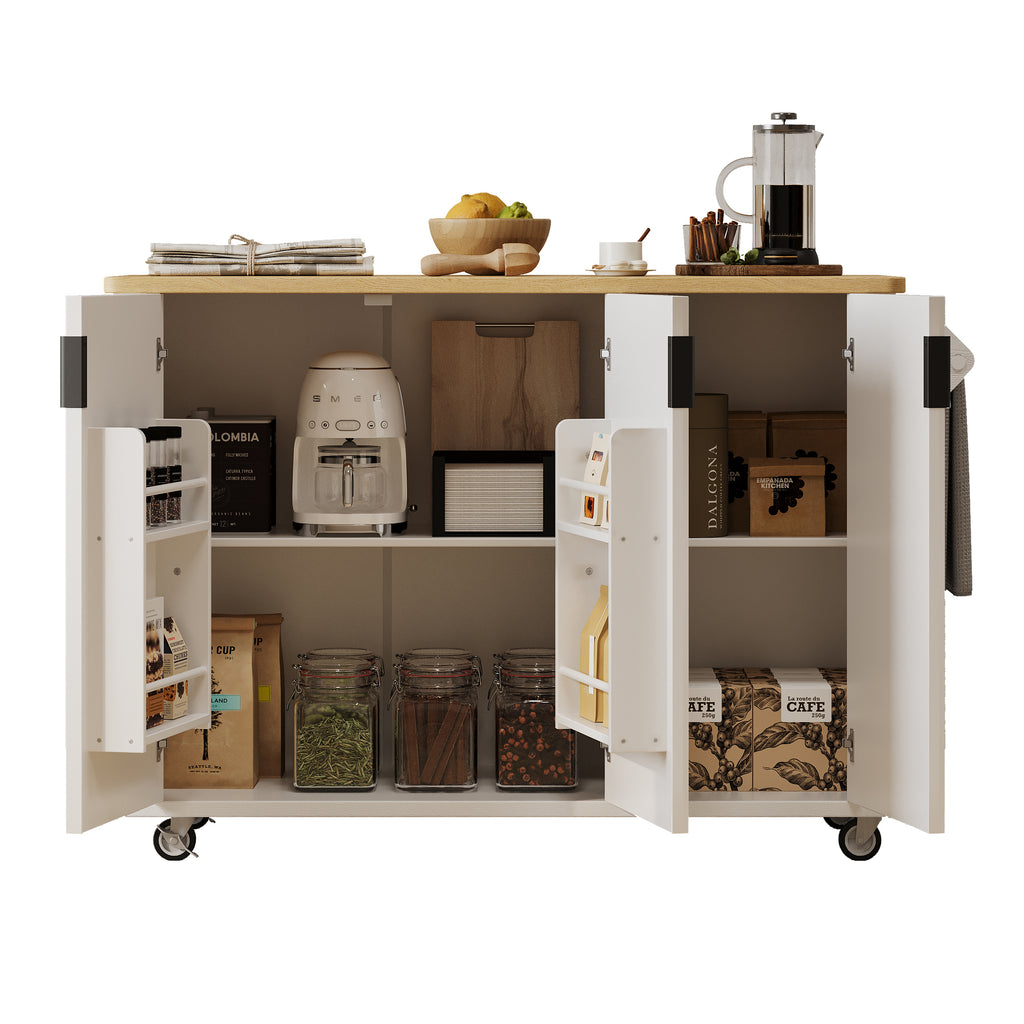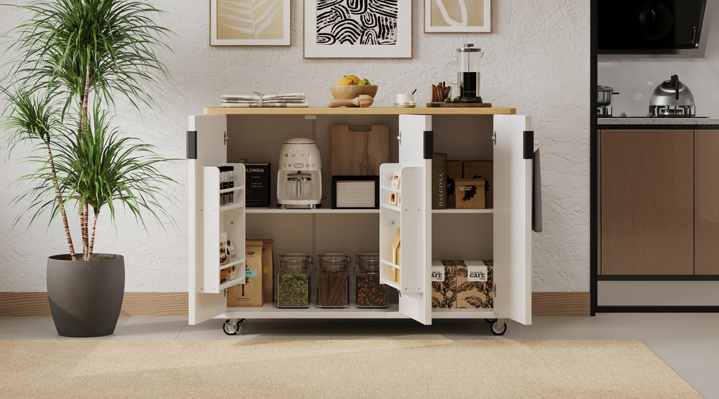 - [Internal Storage Racks] Our rolling kitchen island features an internal storage rack design inspired by the functionality of refrigerator doors. These racks effectively optimize storage capacity while occupying minimal space, making them an ideal addition to kitchens, dormitories, offices, bedrooms, and dining areas.
