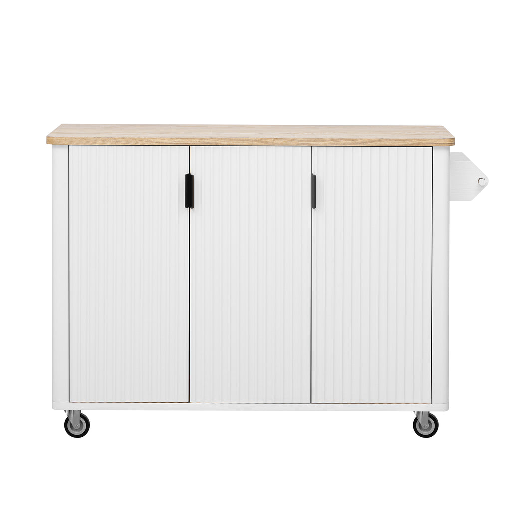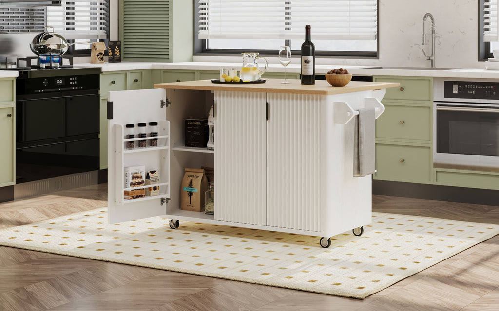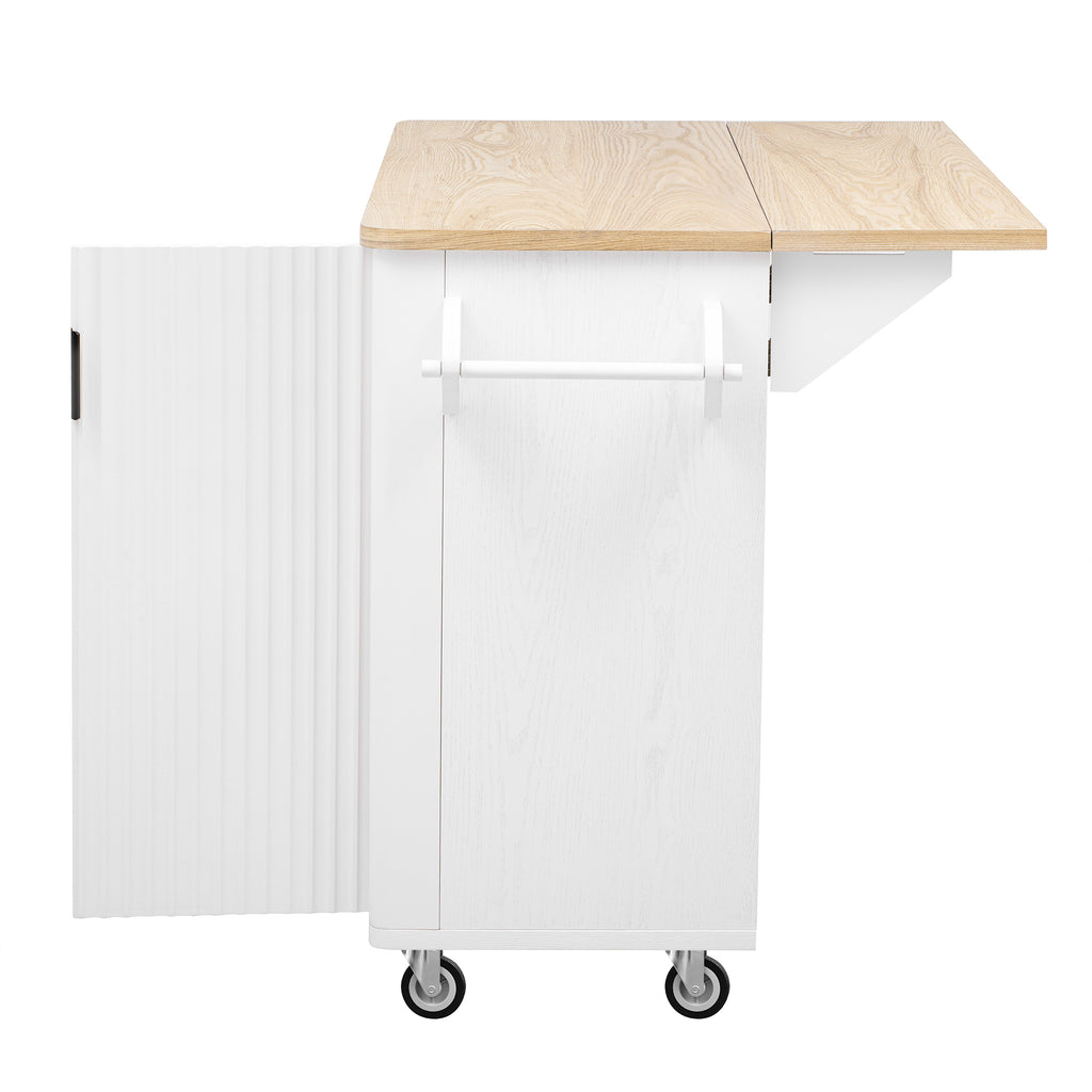 | Highlights | [Large Drop Leaf][2 x Internal Storage Racks][Adjustable Shelf] [Unique Waveform Fluted Panel][Towel Rack][Smooth Curved Edge] [0.98inch Thick Counter Top][Ash Veneer Cabinet] [Cover With Paint][4 * 360°Smooth Rotation Wheels ] [Stationary Storage Island][Hydraulic Hinge][Solid Pine Wood Feet] |
