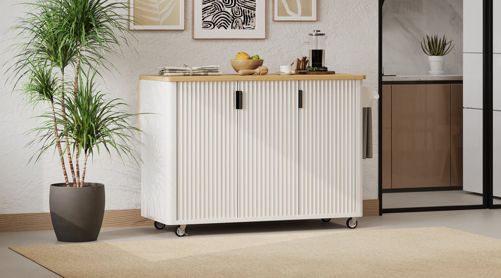 | Summary | The kitchen island fuses farmhouse style, high-end details, and versatile storage. Crafted from CARB Phase II certified MDF boards + ash veneer, its 47''-wide countertop features a smooth, scratch-proof ash veneer finish table that's great for food prep. this Three-doors cabinet combines retro colors and unique waveform fluted and smooth curved edge details that instantly upgrade any space. Whether you're furnishing your Kitchen, Dining Room, or home corridor, you'll love how this leisurely island provides ample storage space for your household needs with internal storage rack and adjustable shelves. Our kitchen island on wheels is designed with 4 x 360-degree wheels, including two locking wheels to meet your desire to move everywhere smoothly and stabilize. |