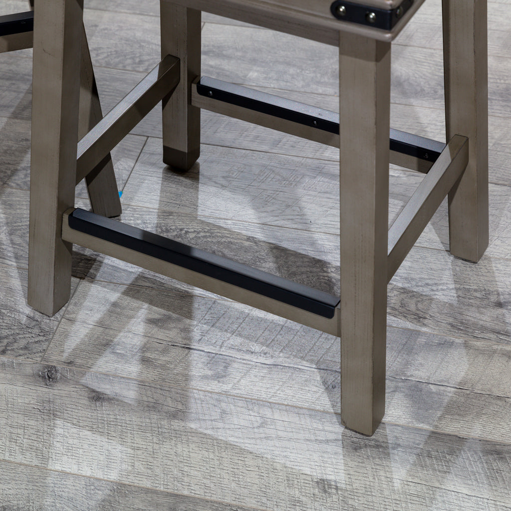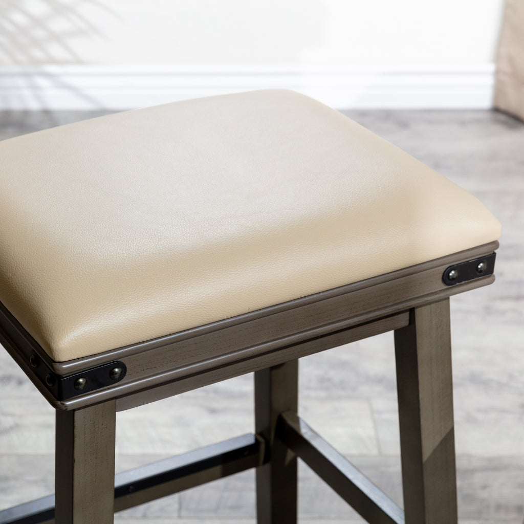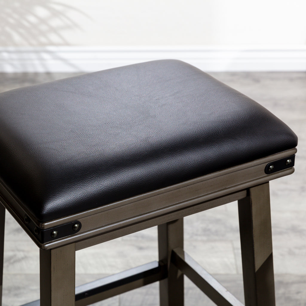 Expertly crafted these contemporary stools are finished in a beautiful espresso, antique white and weather gray finish complemented by a bonded leather cushioned seat and decorative metal accents. Available in 24' counter height or 30' bar height.
