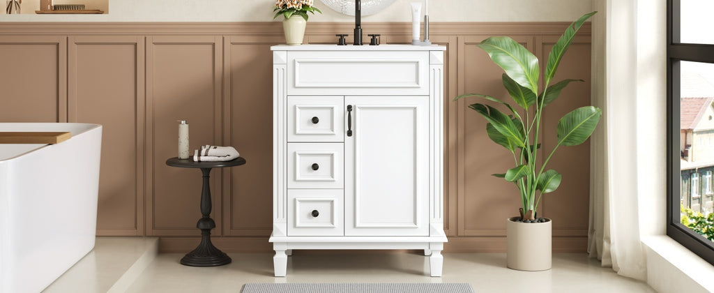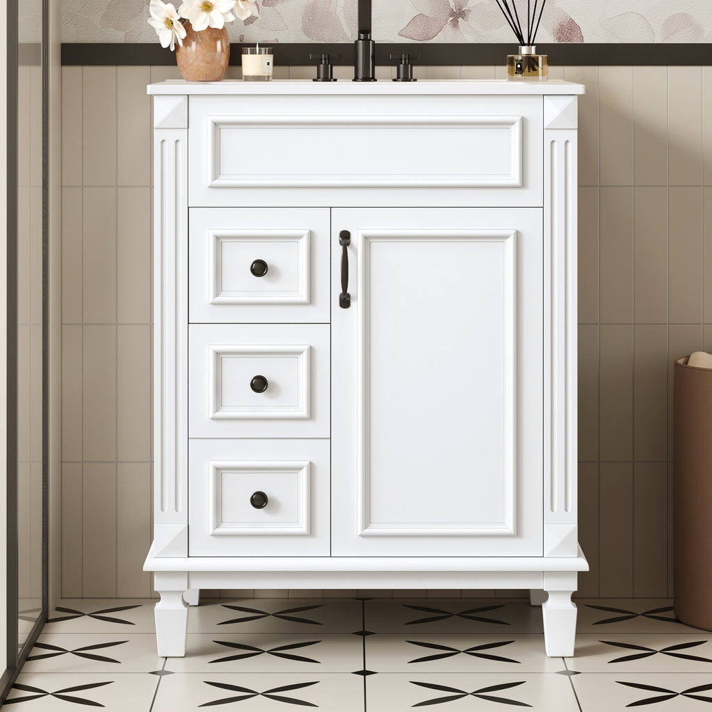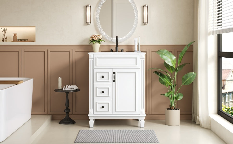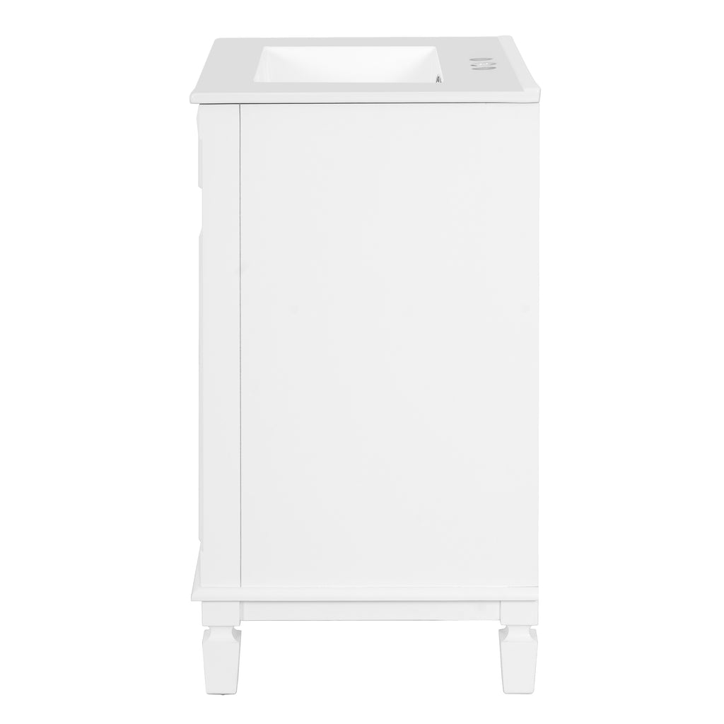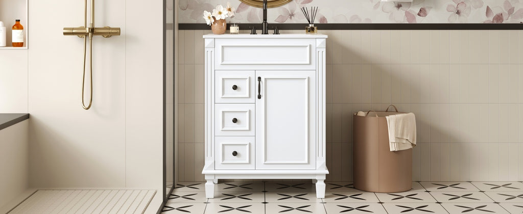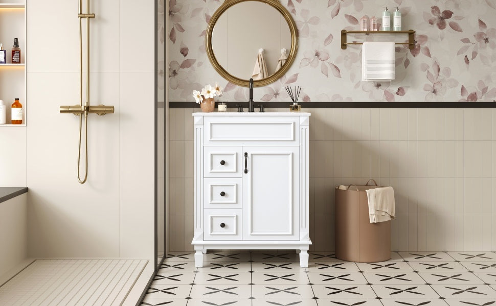This charming French-inspired bathroom vanity blends timeless elegance with smart functionality, perfectly designed for compact spaces. Its space-saving footprint features a premium ceramic basin, complemented by vintage-inspired button handles and delicate stripe carvings for sophisticated flair. Thoughtful storage solutions include two deep drawers with smooth-gliding rails and an adjustable shelf, all enhanced by whisper-quiet soft-close hinges. The versatile design effortlessly complements both modern and traditional bathrooms, offering a perfect balance of refined aesthetics and everyday practicality that elevates any small bathroom.