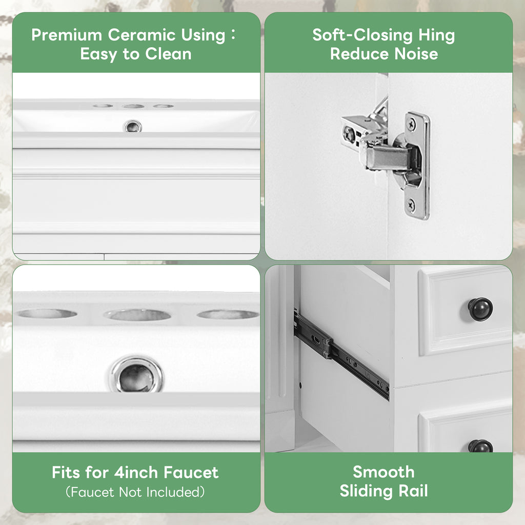 - [Quiet and Smooth Operation] Equipped with soft-closing hinges, this vanity minimizes noise when closing doors. The drawers glide smoothly on high-quality rails, providing a seamless user experience. These thoughtful details enhance everyday convenience while preserving the vanity’s elegant aesthetic.